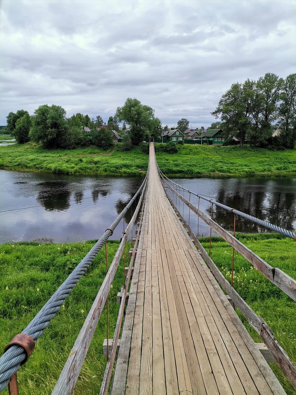 Над рекой Мстой в прибрежных сёлах 🏘 раскинулись лёгкие деревянные подвесные мосты . Они надёжно соединяют берега и украшают пейзаж .