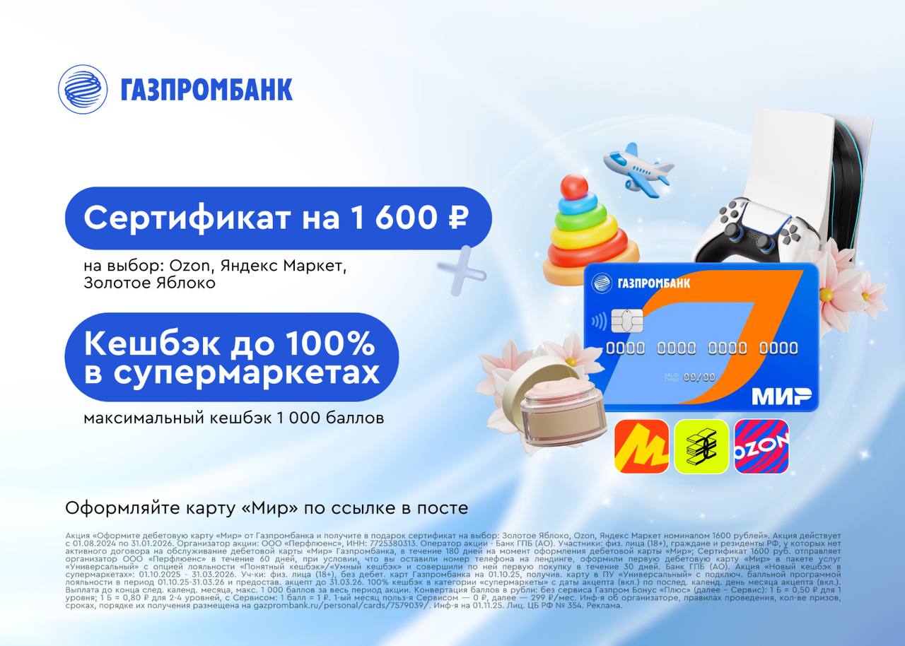 получите в подарок сертификат на 1600 ₽ на выбор: Золотое Яблоко, Яндекс Маркет или Ozon.