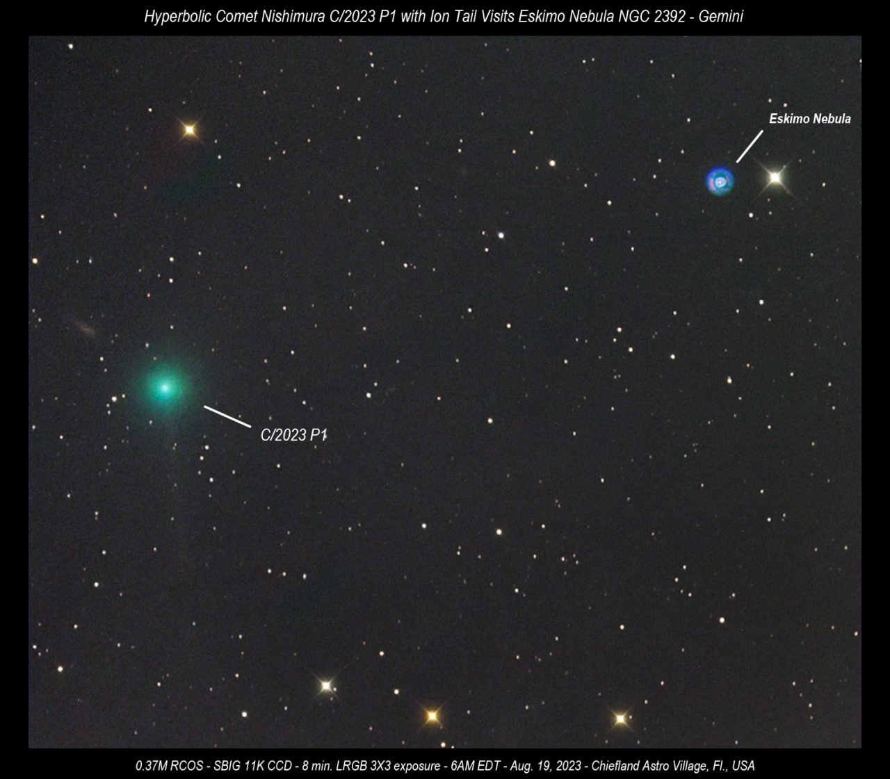 На фото : 19-20 авг. C/2023 P1 сблизилась с яркой (9.1V) планетаркой "Эскимос" в созвездии Близнецов.