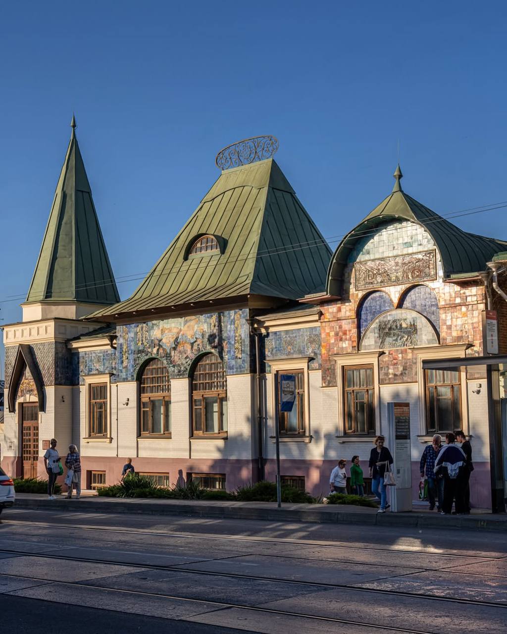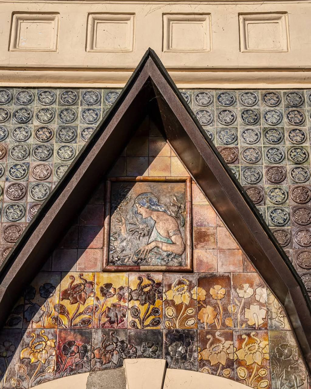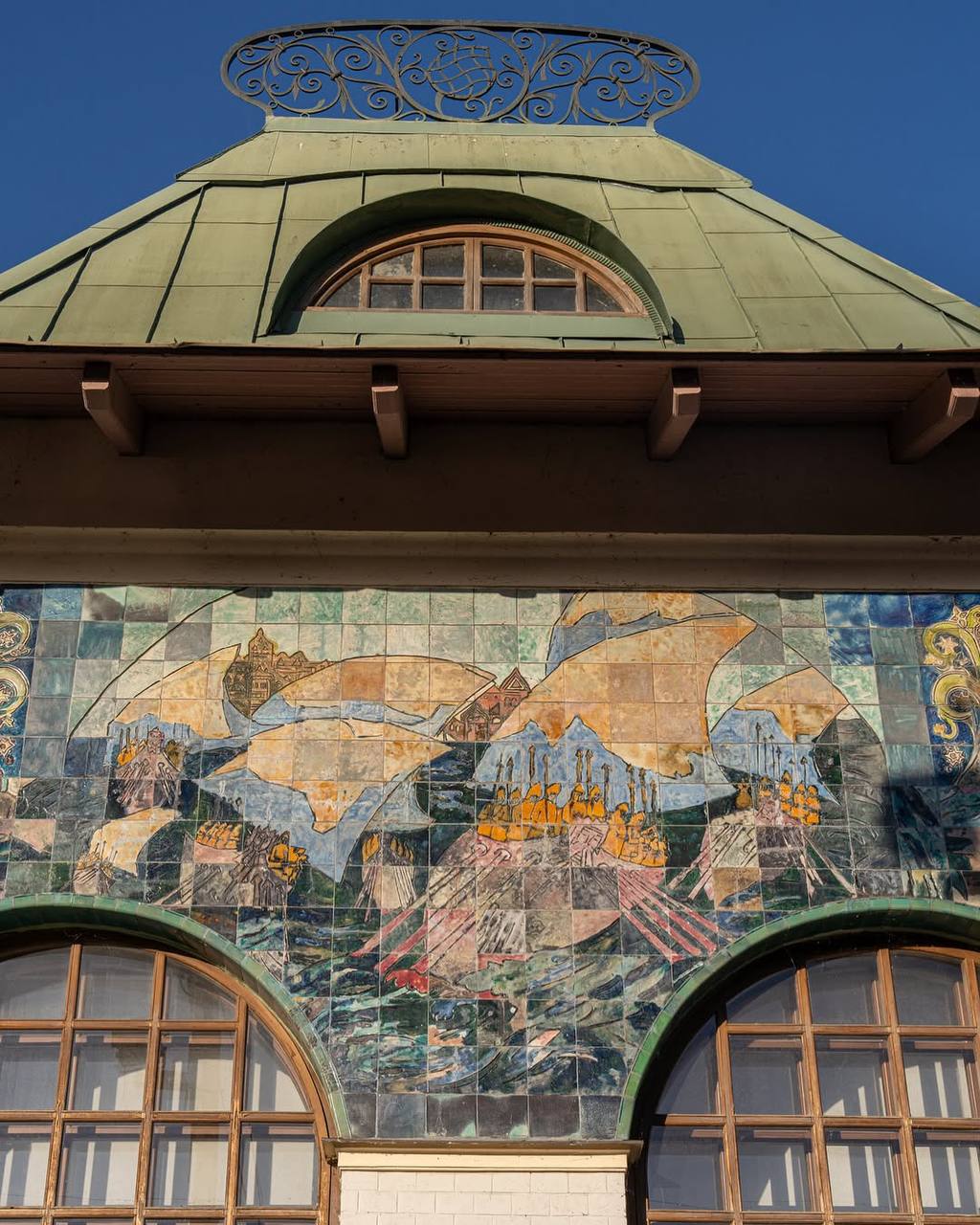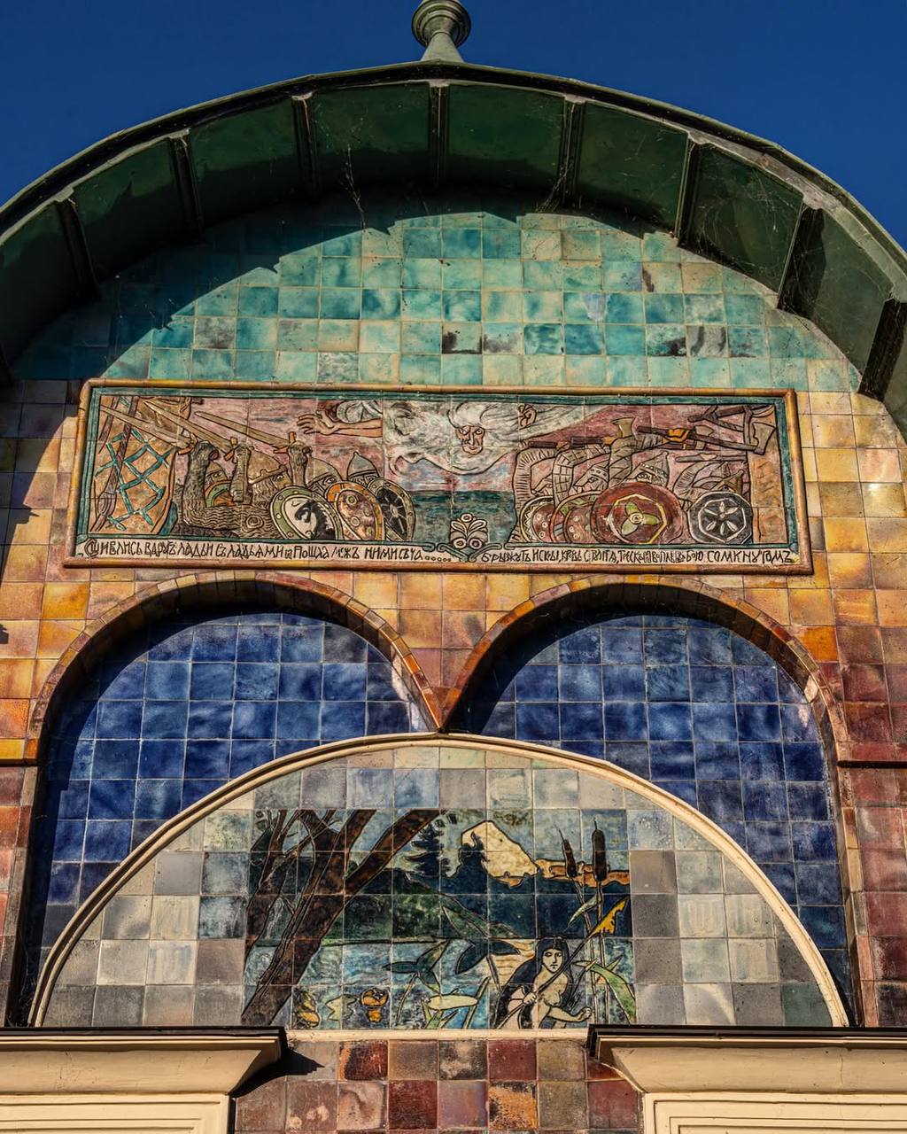 Фасад здания украшен майоликой, изготовленной на Абрамцевском заводе в Москве. Эскиз панно с девушкой над входом выполнен Врубелем, панно в полукруглом аттике с изображением батальной сцены выполнено по эскизу Виктора Васнецова. Под сценами надпись на старославянском «Сшиблись вдруг ладьи с ладьями и пошла меж ними сеча…»