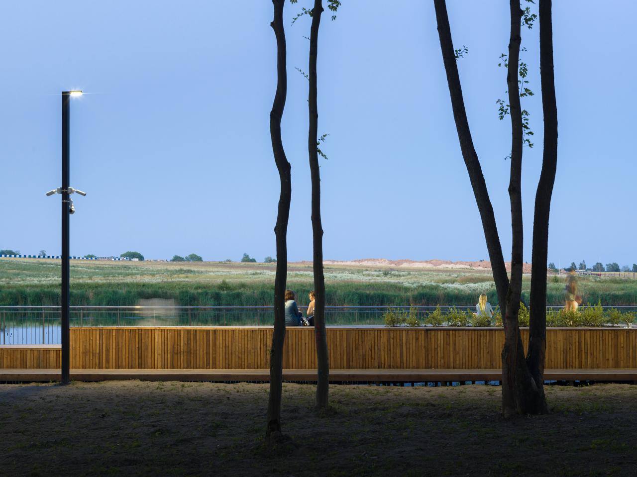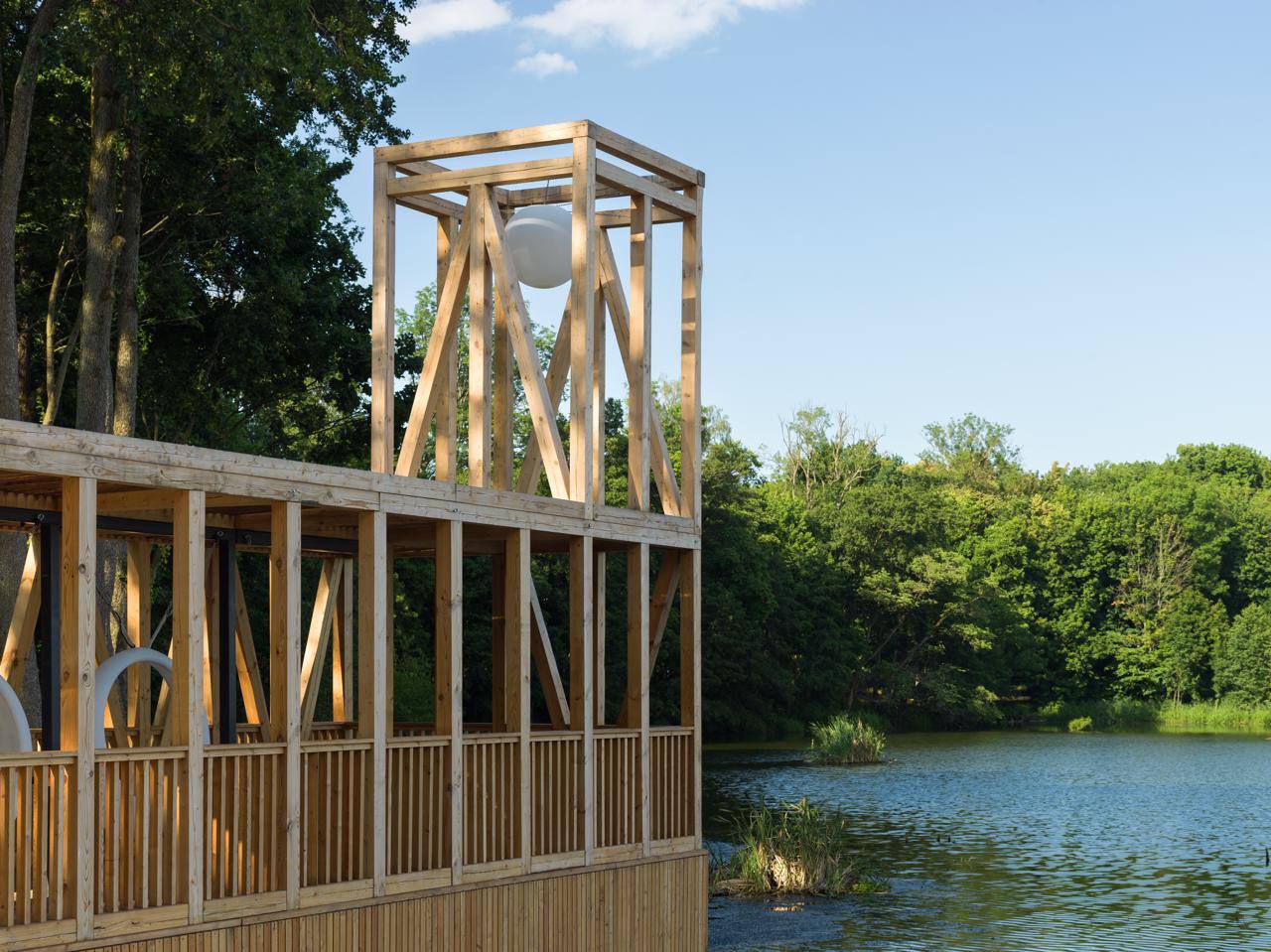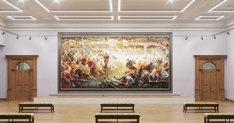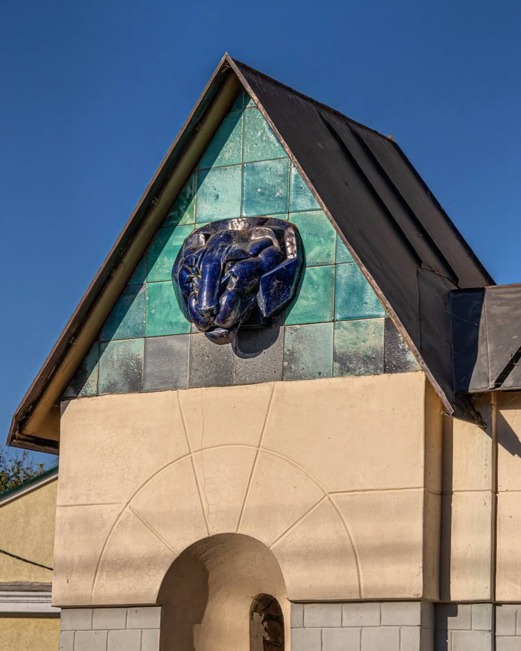 Фасад здания украшен майоликой, изготовленной на Абрамцевском заводе в Москве. Эскиз панно с девушкой над входом выполнен Врубелем, панно в полукруглом аттике с изображением батальной сцены выполнено по эскизу Виктора Васнецова. Под сценами надпись на старославянском «Сшиблись вдруг ладьи с ладьями и пошла меж ними сеча…»