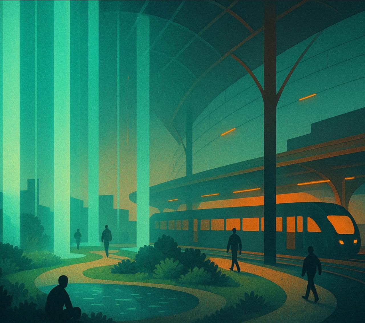 <blocТранспортно-пересадочный узел как оазис в мегаполисе: гармоничная экосистема, объединяющая транспорт, природу и человека. Здесь пересадка превращается в приятный перерыв для отдыха и восстановления.
