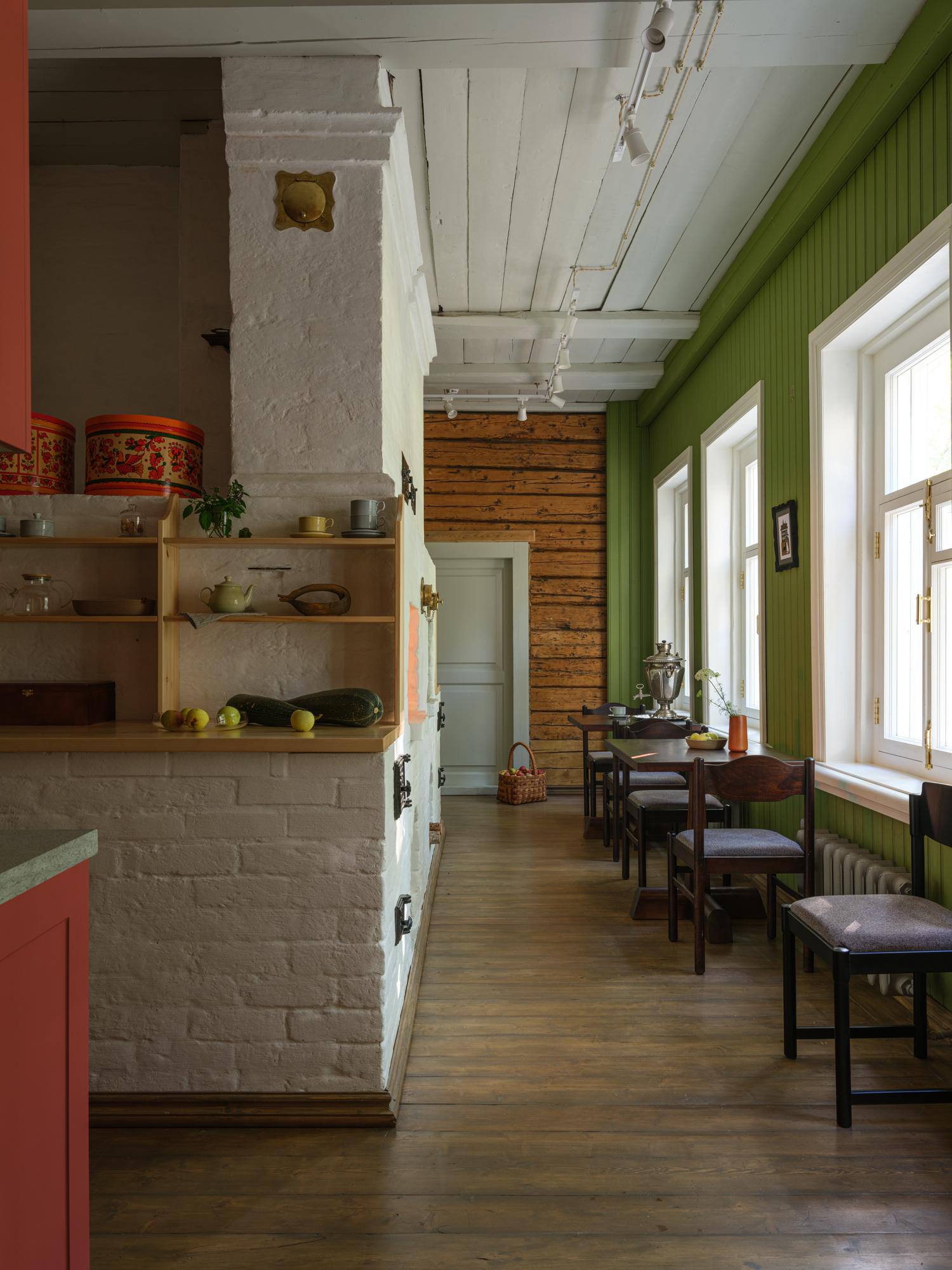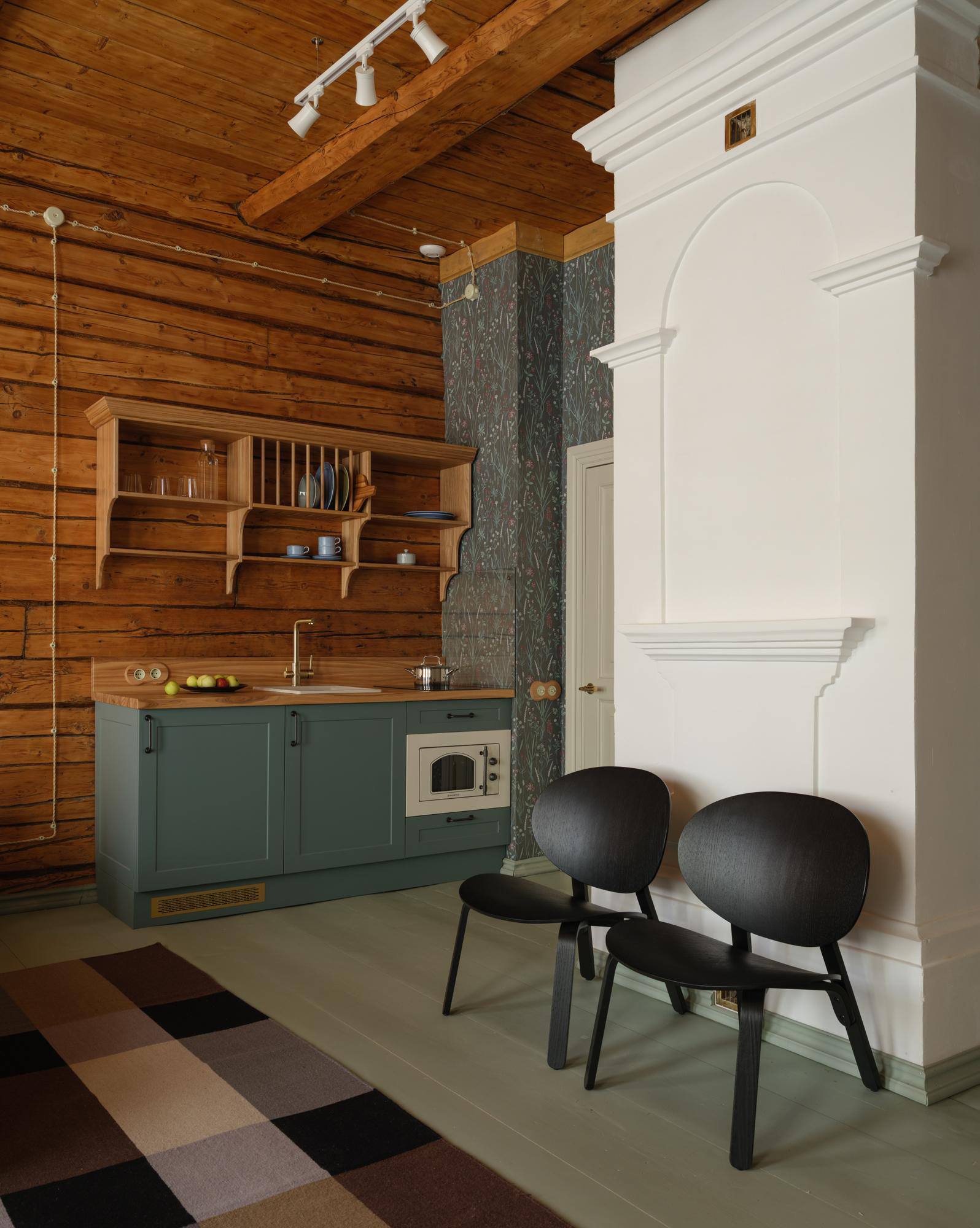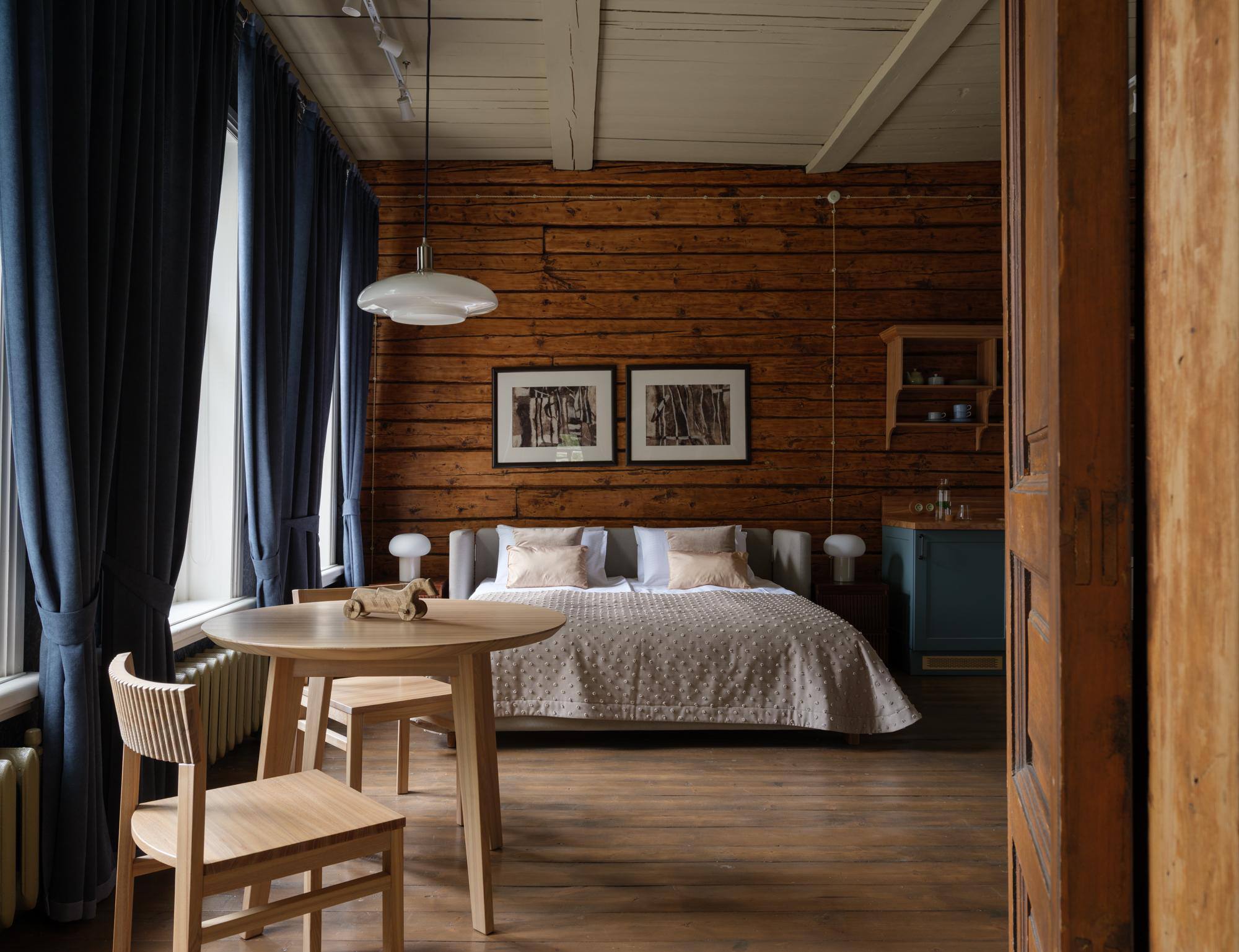 🔸В интерьерах сочетаются антикварная мебель начала ХХ века и современная мебель от бюро Valkeda с историческими, локальными мотивами. Стилистика и цветовое решение комнат вдохновлены цветовой гаммой и фактурой материалов монастырей, расположенных возле Вологды, окружающей их северной природой (вода, камень, дерево, синий/голубой, зеленый, охра, черный цвета).