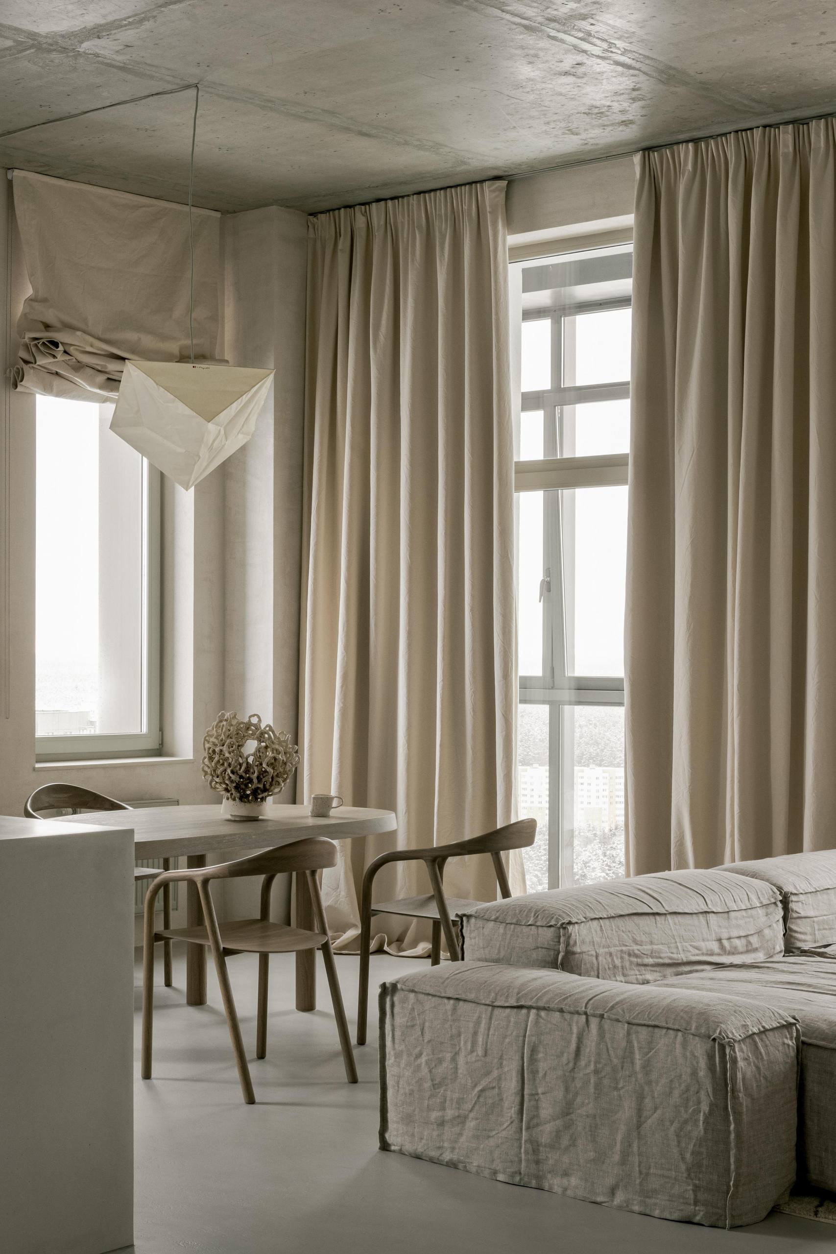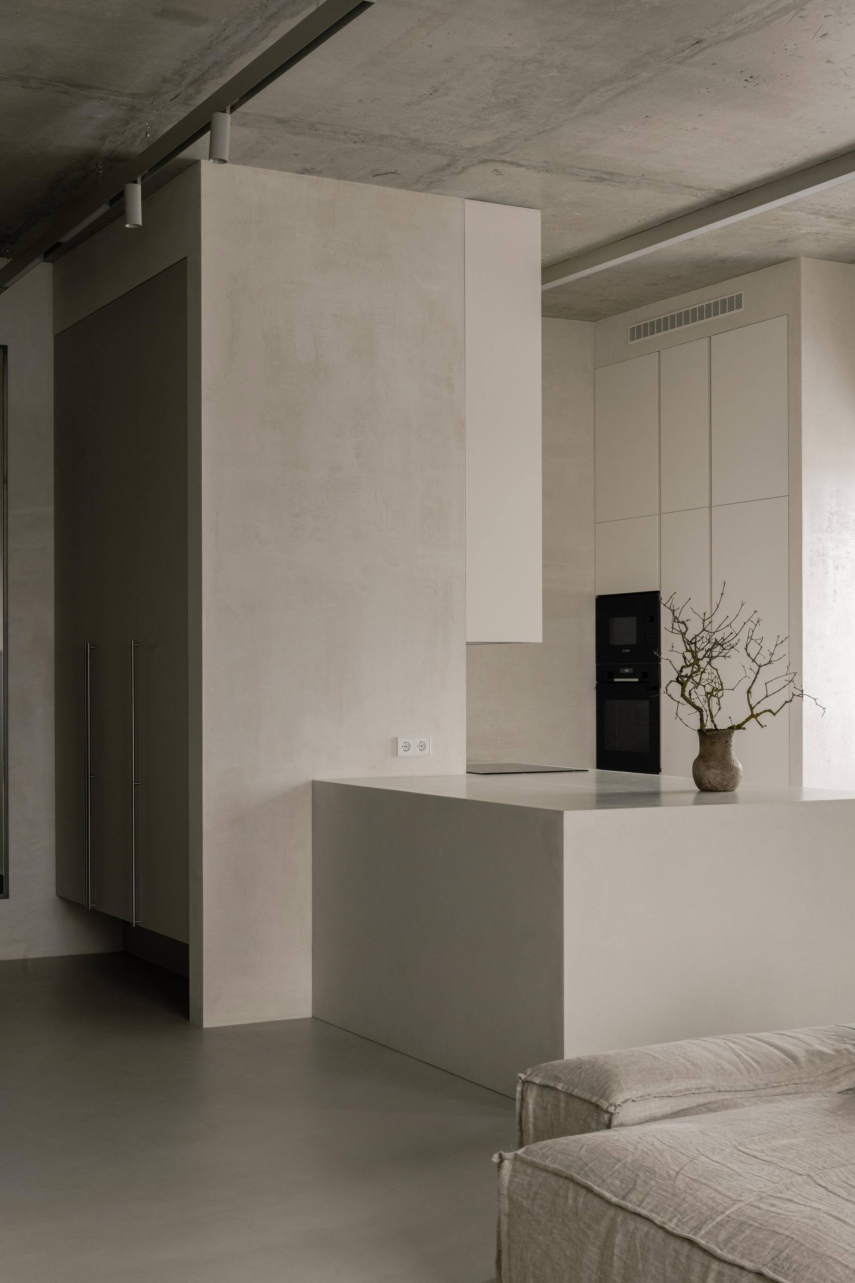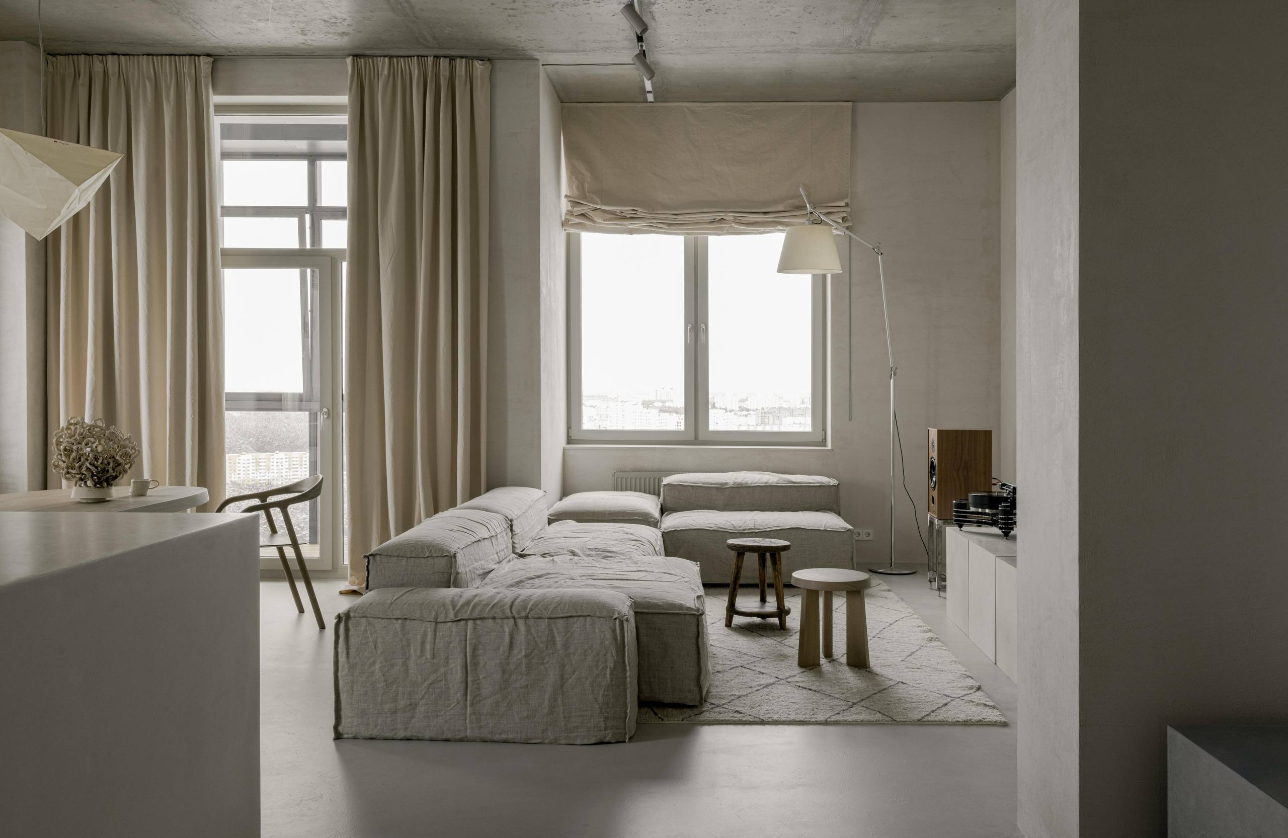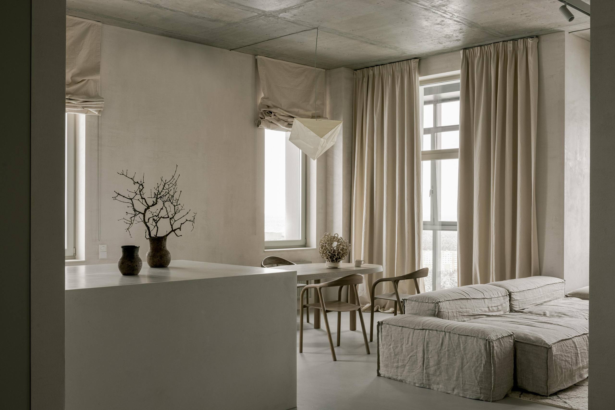 🔸Автор создал интерьер для собственной квартиры. «Мне хотелось создать простой, аскетичный, неподвластный времени интерьер, убедительно передающий мой вкус и стиль. Неприемлемым для меня было использование ярких цветов, акцентов или узоров». Строгие архитектурные формы с необработанным бетонным потолком смягчены гипсовой штукатуркой стен естественного цвета, белорусским льном и хлопком натурального цвета.