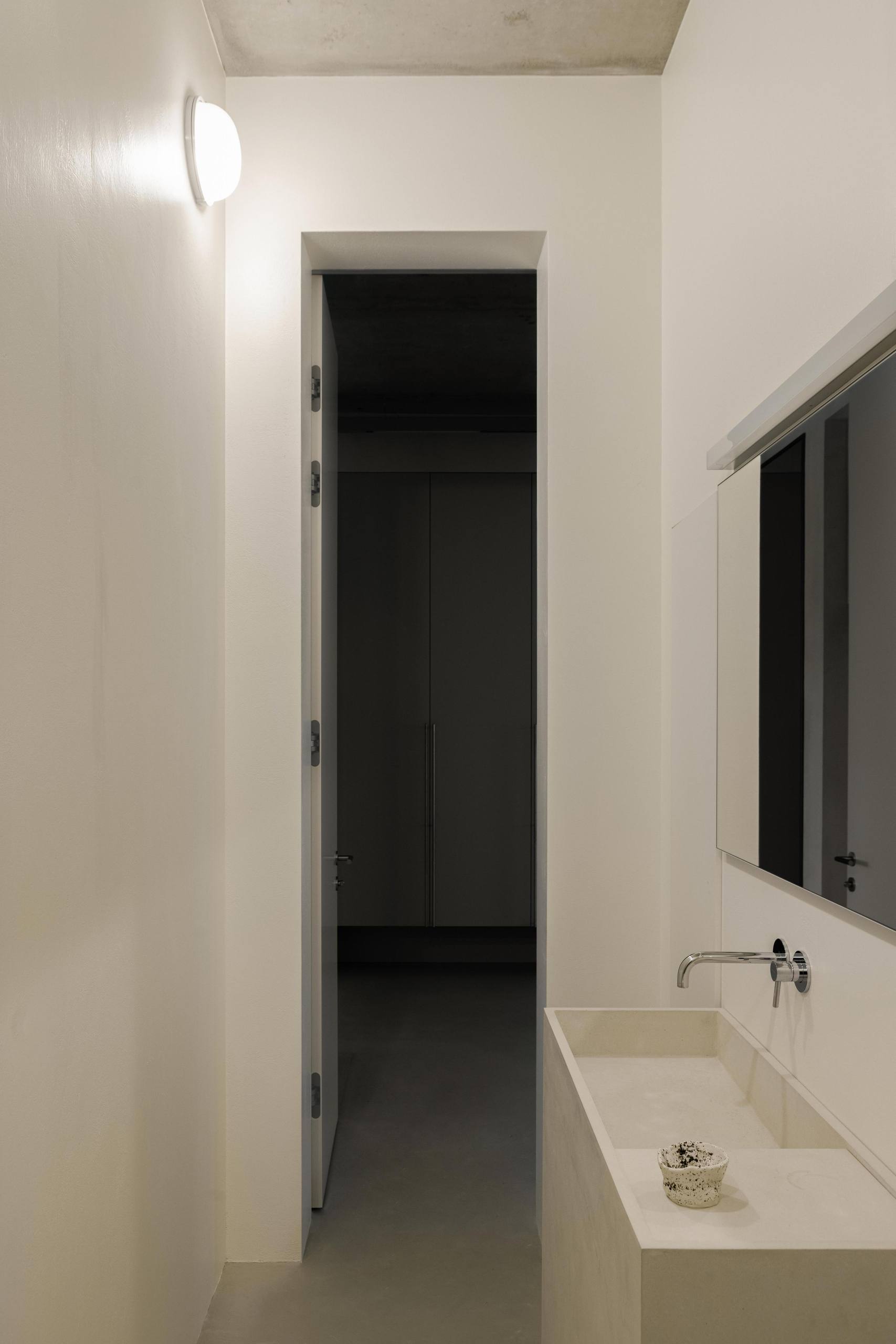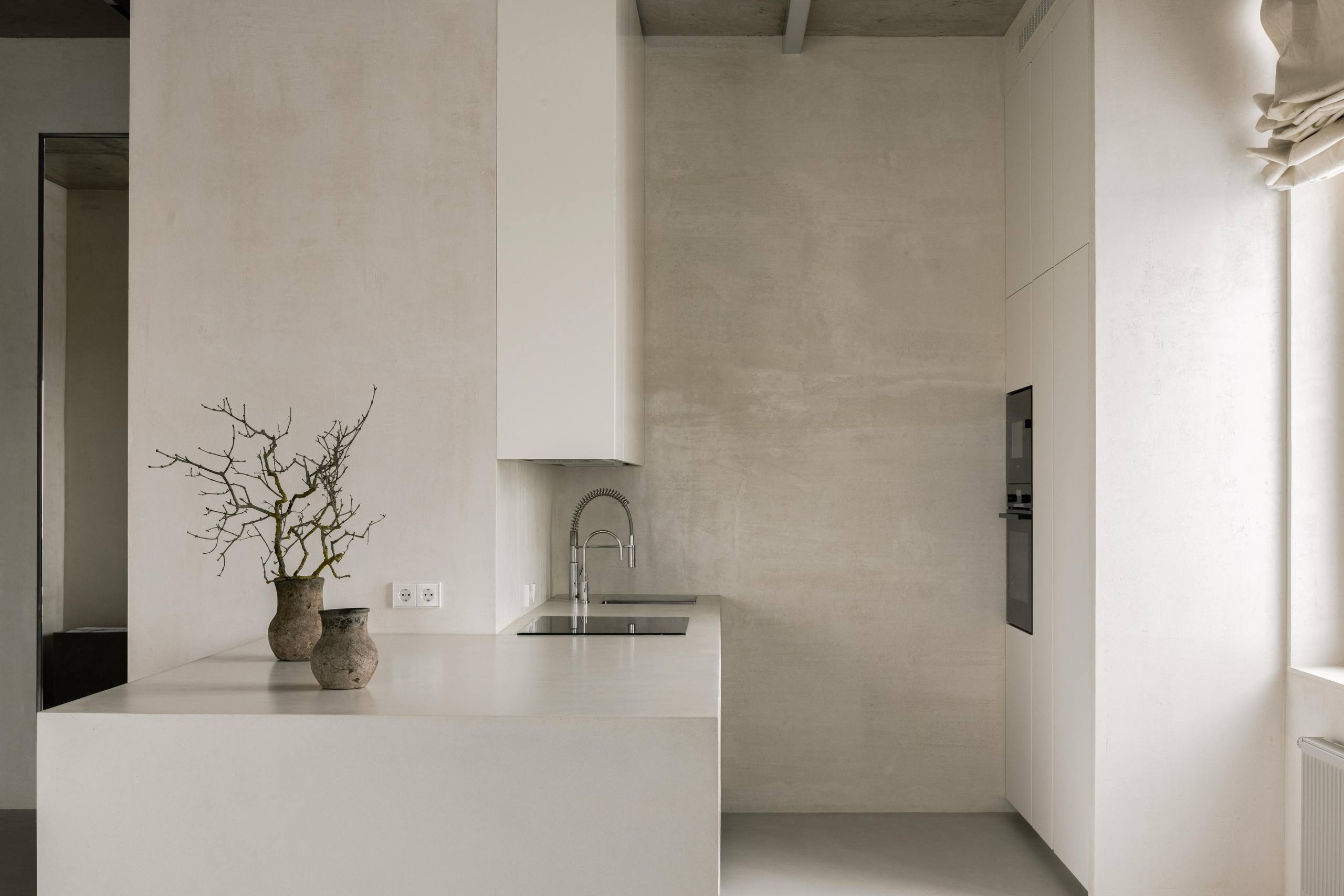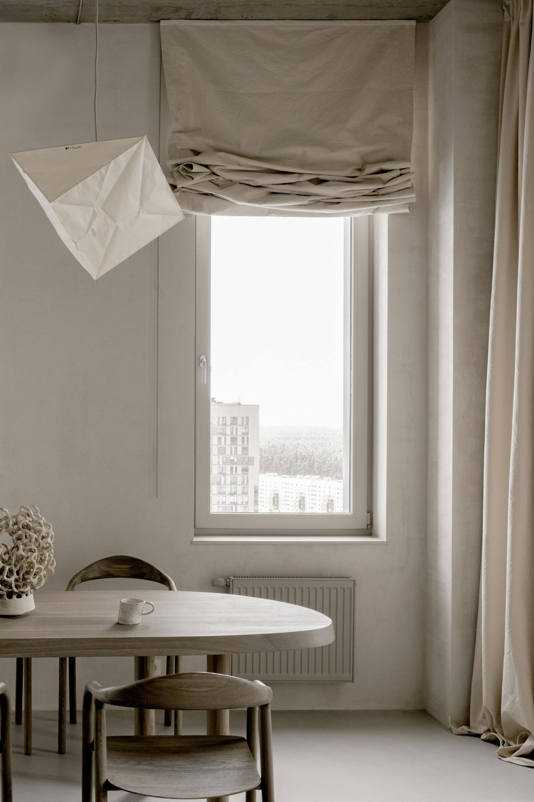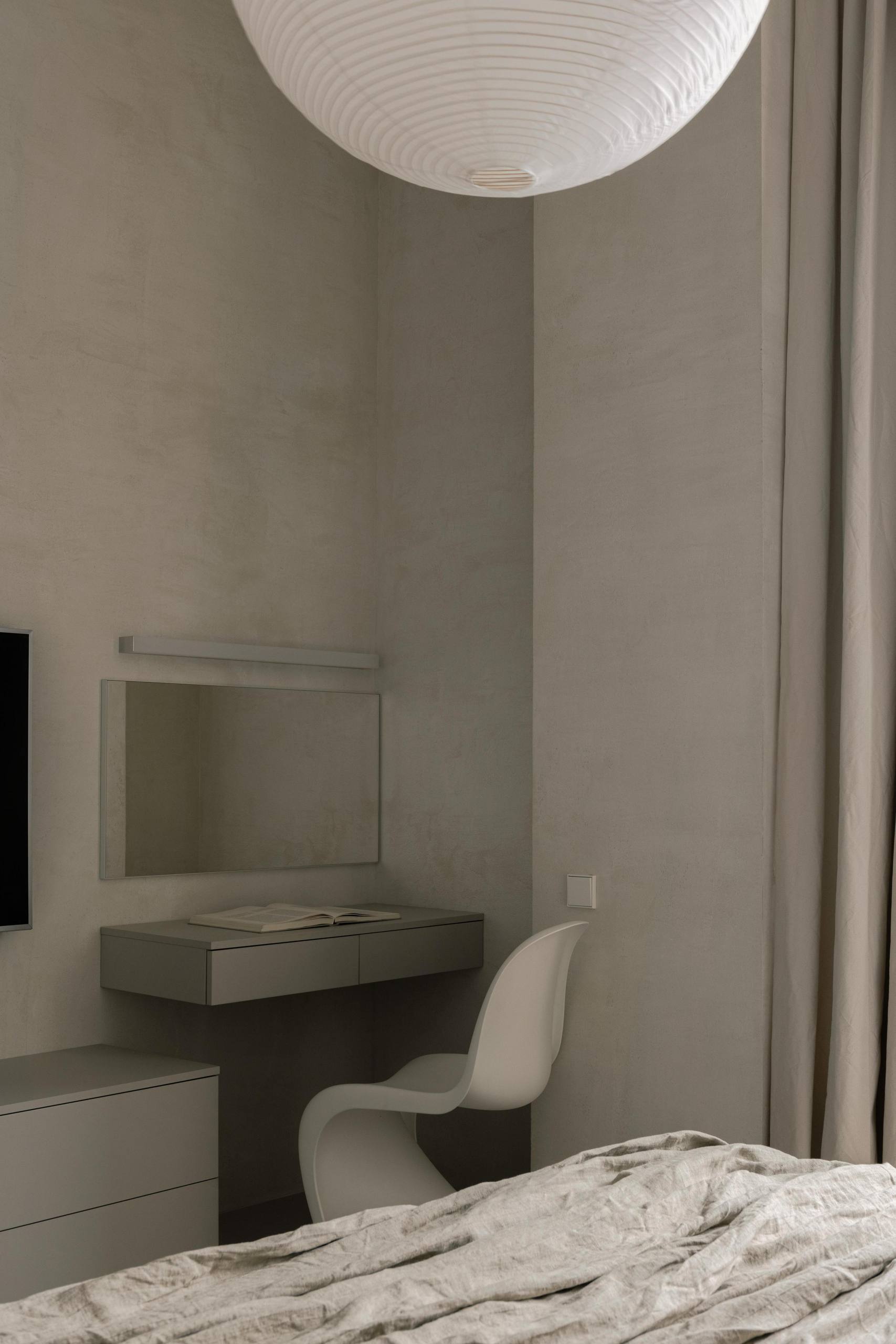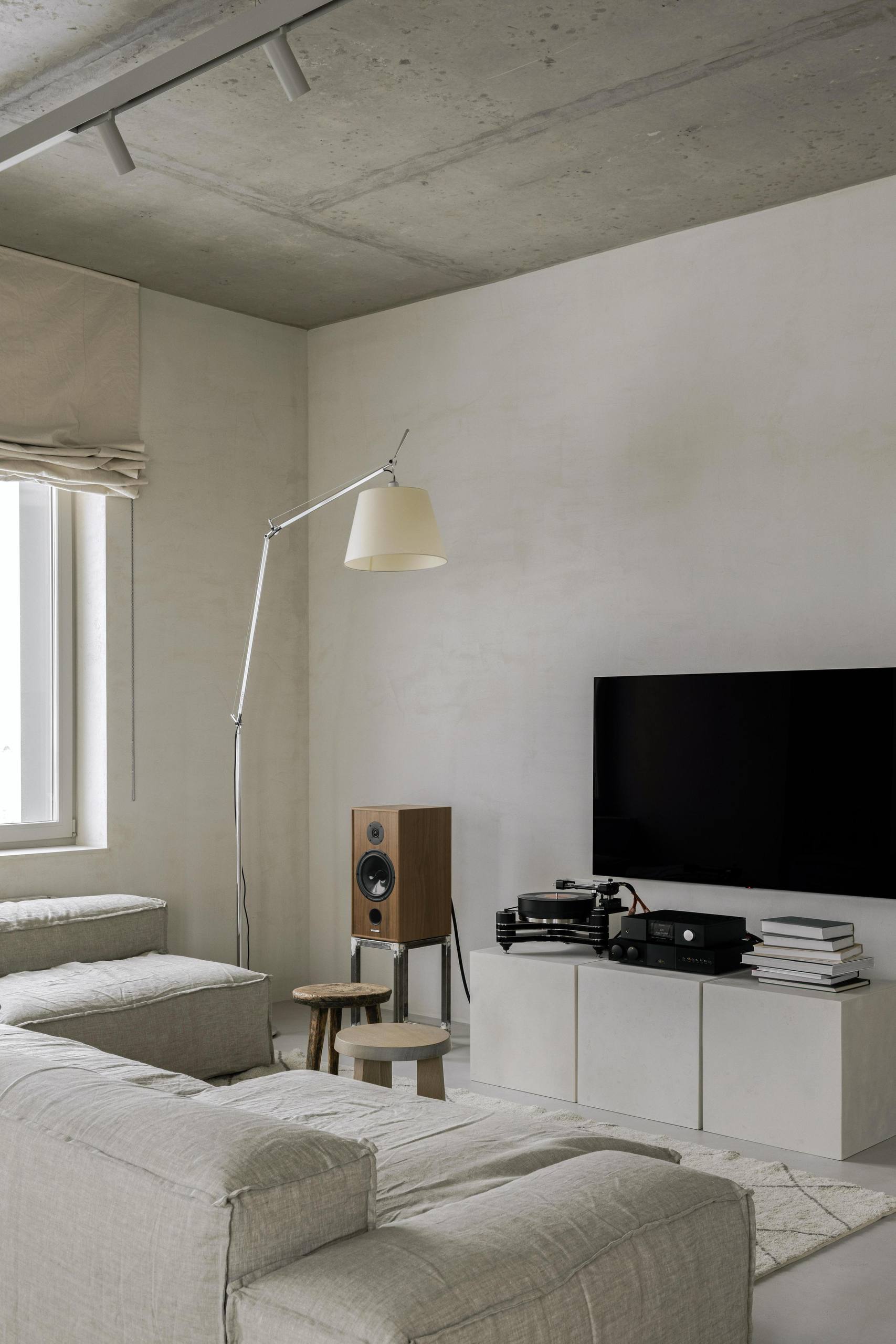 🔸Автор создал интерьер для собственной квартиры. «Мне хотелось создать простой, аскетичный, неподвластный времени интерьер, убедительно передающий мой вкус и стиль. Неприемлемым для меня было использование ярких цветов, акцентов или узоров». Строгие архитектурные формы с необработанным бетонным потолком смягчены гипсовой штукатуркой стен естественного цвета, белорусским льном и хлопком натурального цвета.