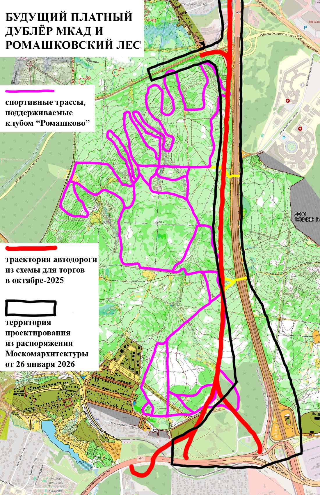 – чьей-то недрогнувшей рукой автотрасса была прорисована прямо по Ромашковской спортивной трассе (затронув ~1,5 км лыжной траектории, включая т.н. Разгонную прямую и Тусовочный перекрёсток).