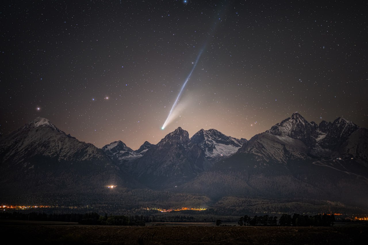 1 - Комета над Верхними Татрами, Словакия Автор: Tomáš Slovinský. 20 октября 2025 года. Сумма 50 кадров полученных с помощью камеры Sony A7III (астро-модифицированная) и объектива Samyang 85mm (30 s, f/1.4, ISO 3200).