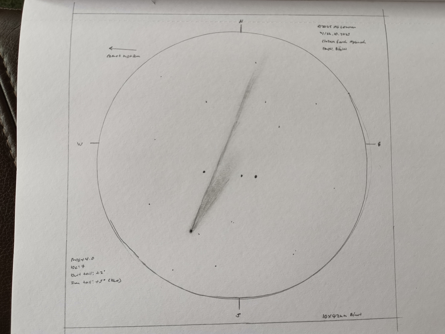 2 - Зарисовка кометы от Martin McKenna под темным небом Сев. Ирландии 21/22 октября 2025 года в бинокль 10х42 мм.