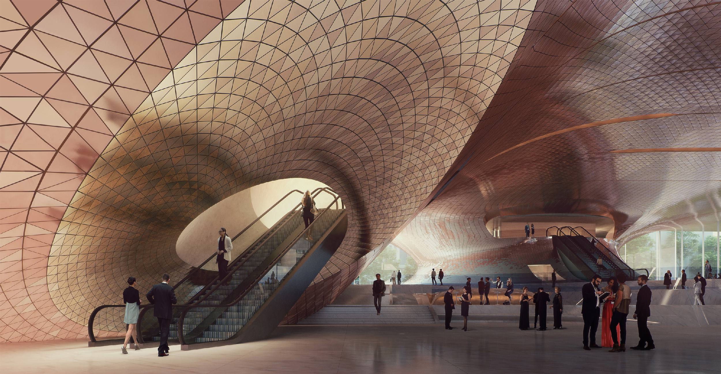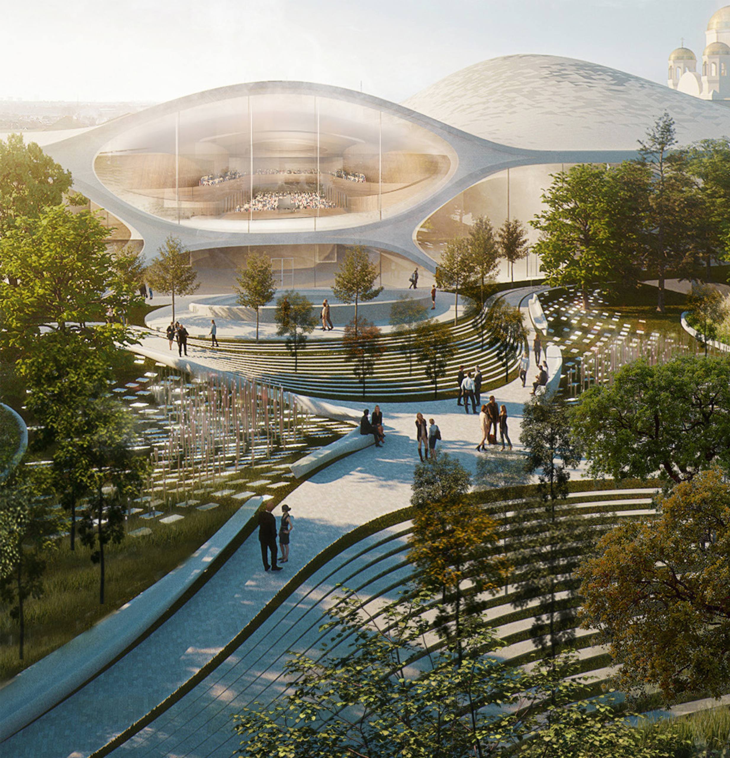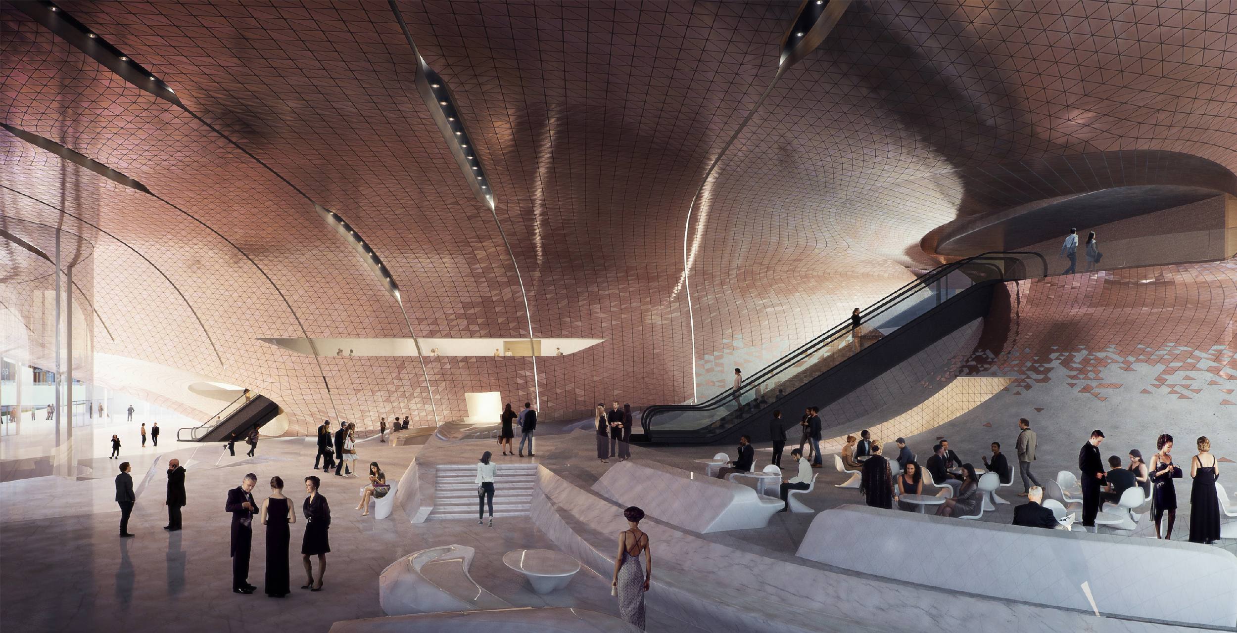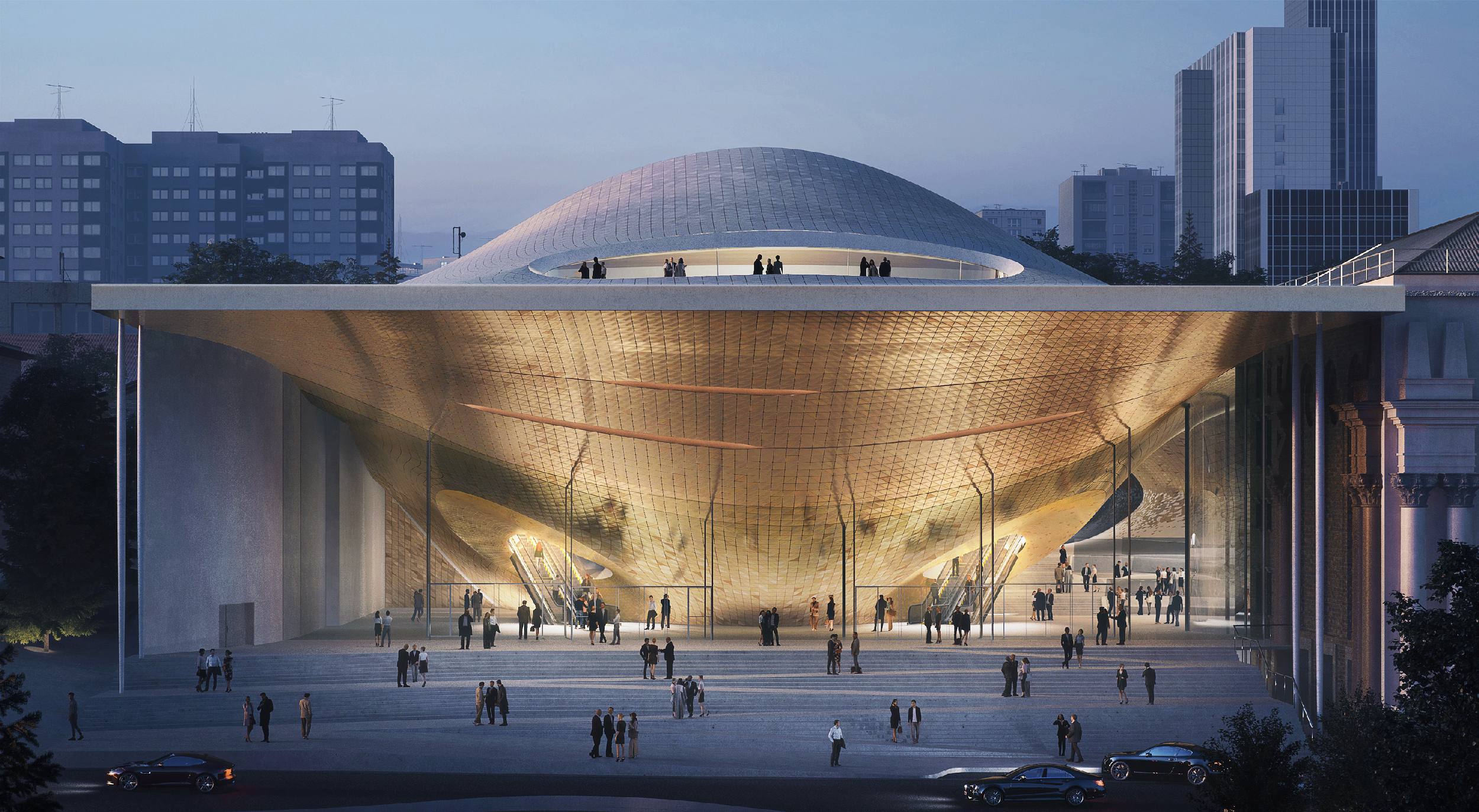 Первоначальный проект, представленный в 2018 году бюро Zaha Hadid Architects (на фото), так и не был реализован. Архитекторы предлагали создать символ гармонии архитектуры, света и звука, вдохновившись формой звуковой волны.