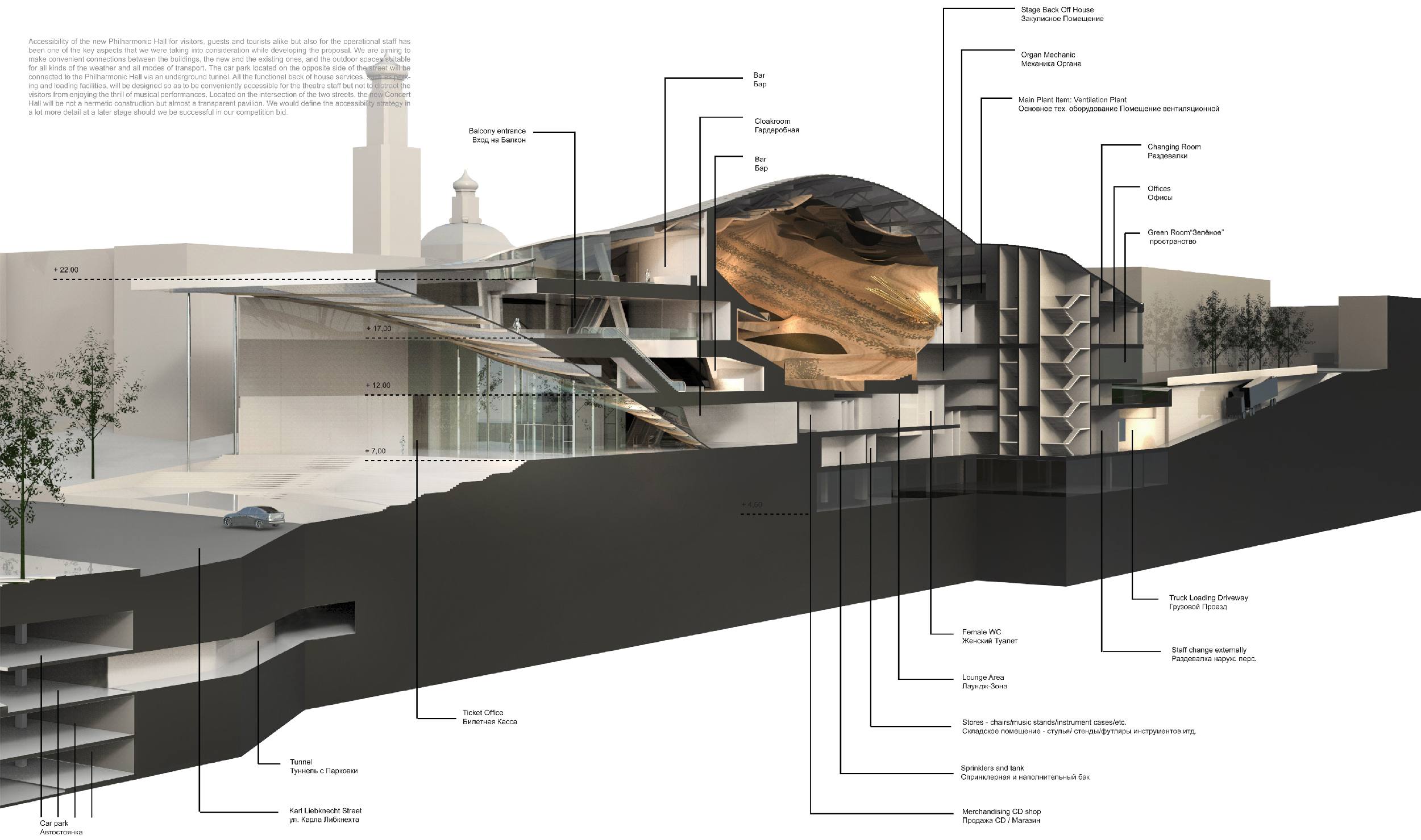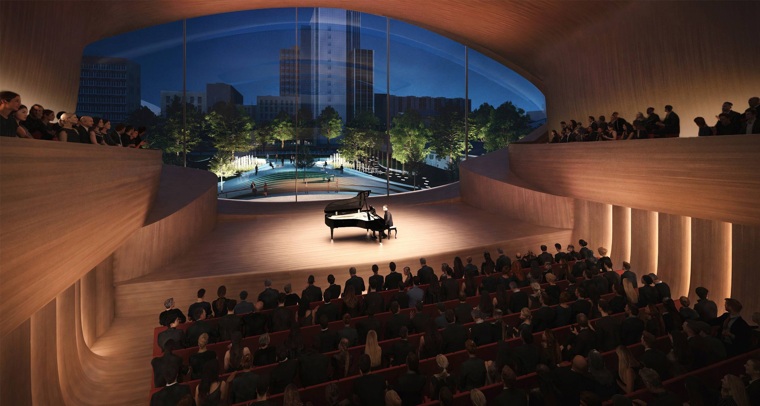 Концепция предполагала два концертных пространства, «подвешенных» под волнообразной стальной кровлей, отражающей физику резонанса. Сквозь стеклянную стену за сценой должен был открываться вид на ландшафтный парк.