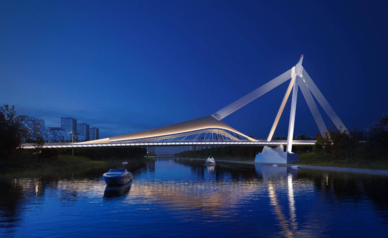 К настоящему моменту смонтировано более половины пролётного строения. Работы ведутся «в навес» — современная технология, позволяющая собирать конструкцию прямо над водой без остановки движения электросудов.