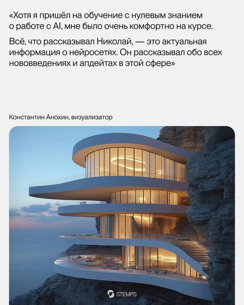 И стать дороже как специалист, то приглашаем вас на пятый поток курса «AI в архитектуре» от платформы STEMPS с упором на практику и применение в реальной работе.
