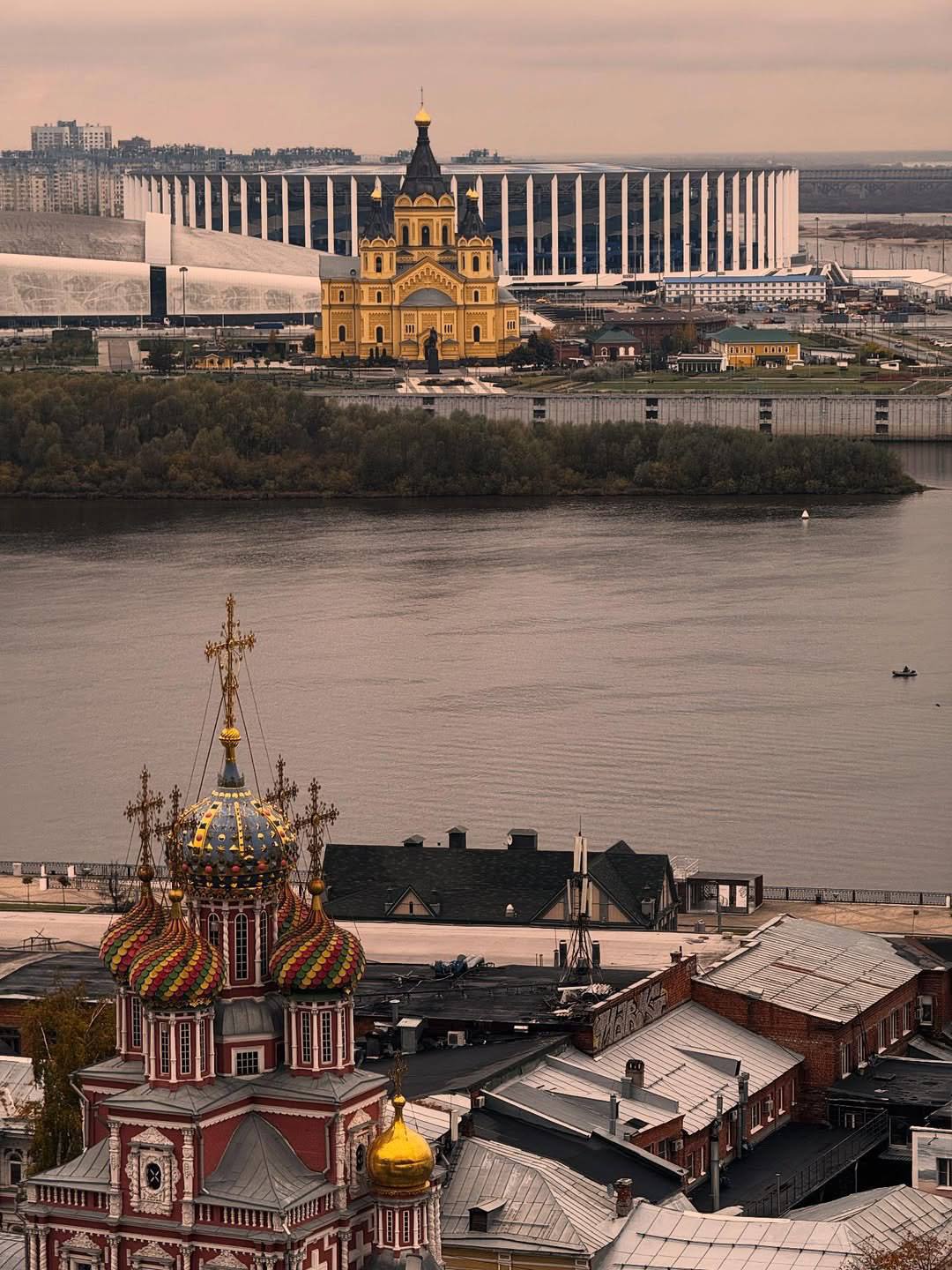 На фото в отдалении можно увидеть футбольный стадион города и Кафедральный собор Александра Невского