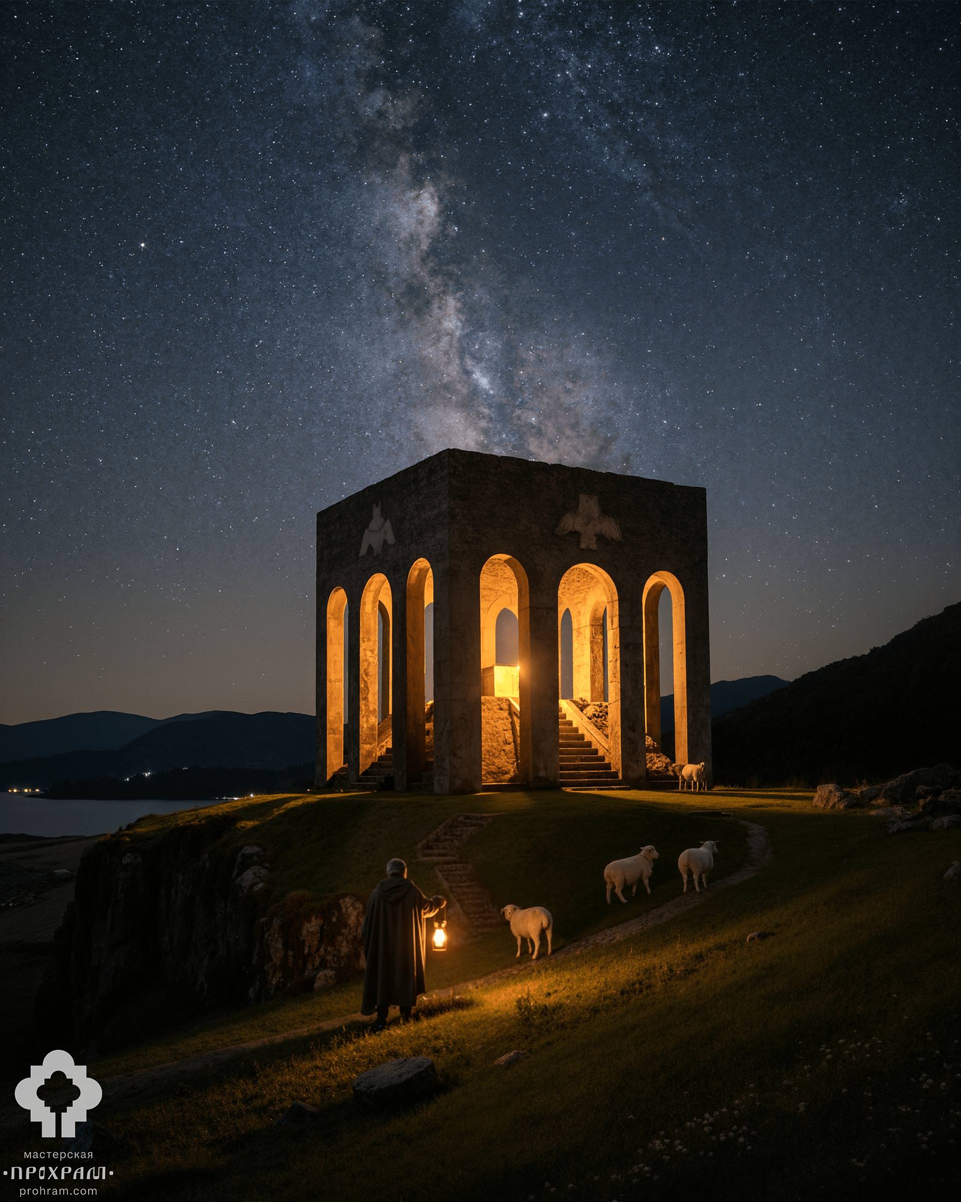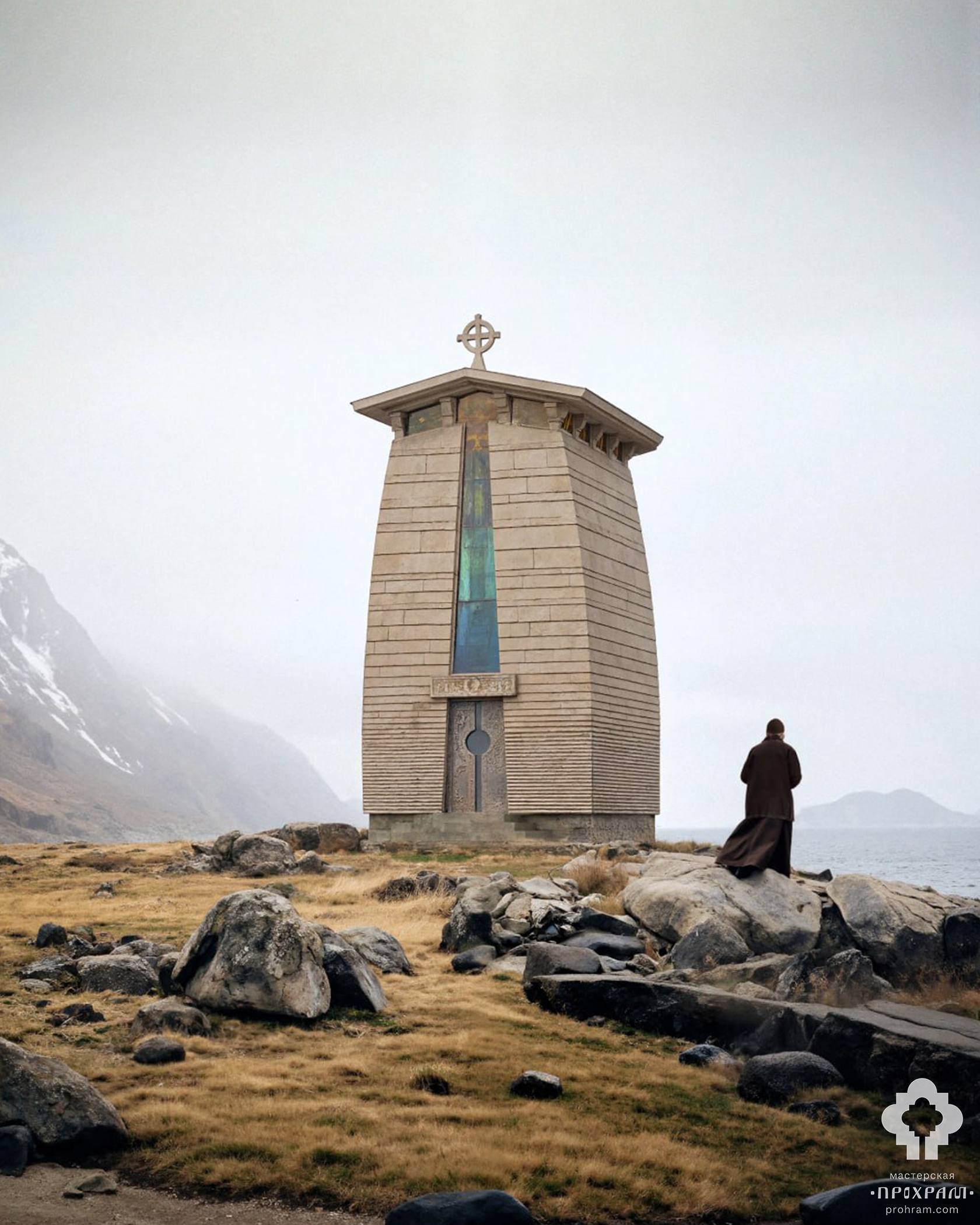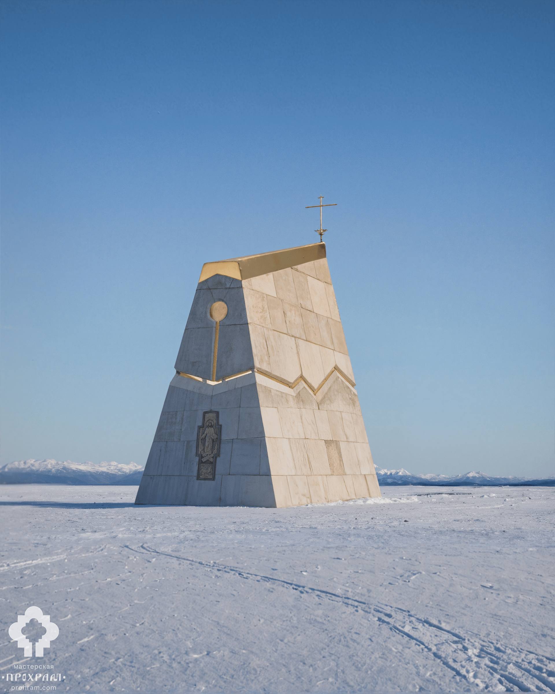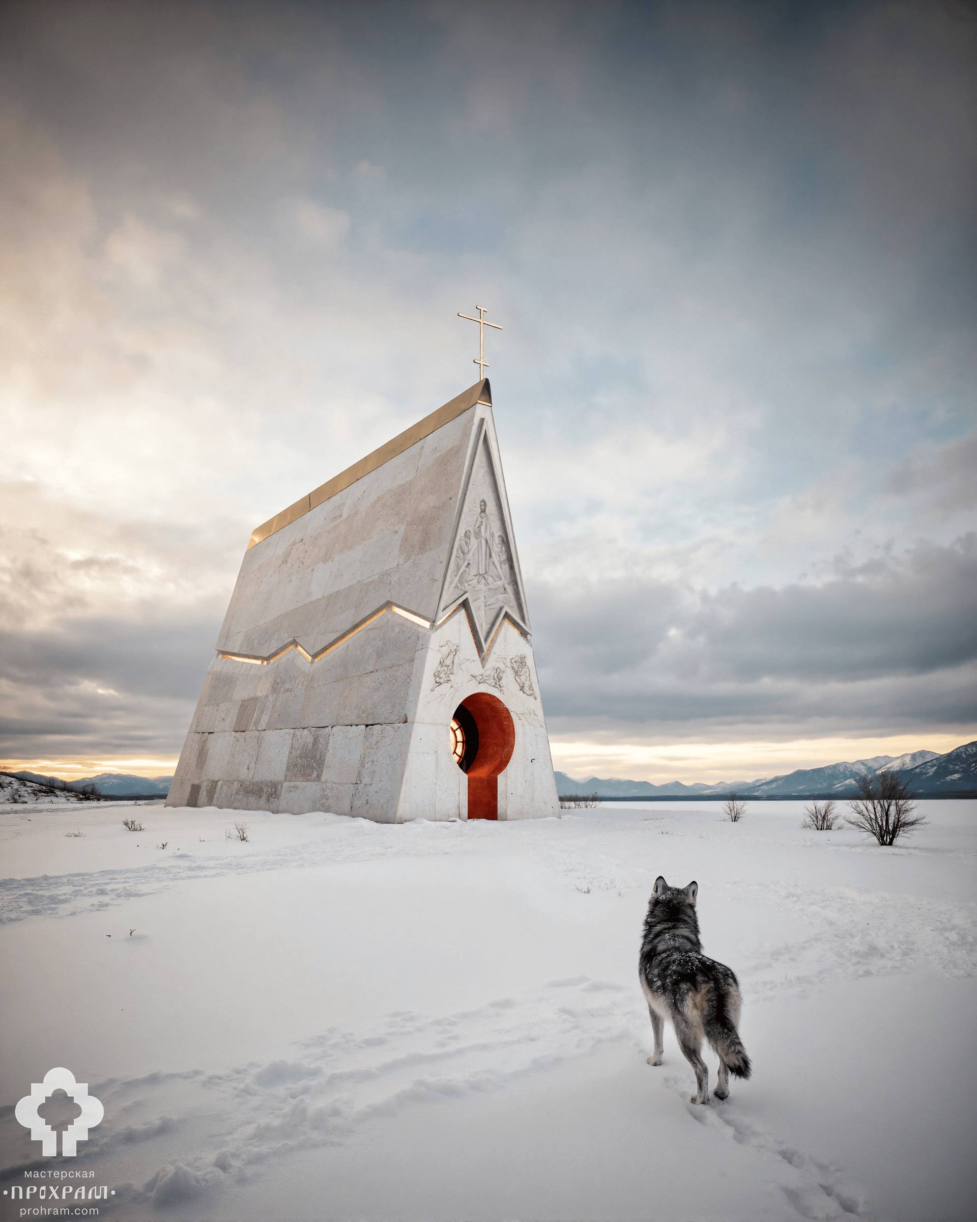🔸Первая часовня предназначена для Севера. Её треугольный силуэт повторяет форму мандорлы на древнерусских иконах, а фасад украшает барельеф Христа. Каменная оболочка подчёркнута линией мягкой подсветки, а алый вход символизирует Божественный огонь (фото 1-2)