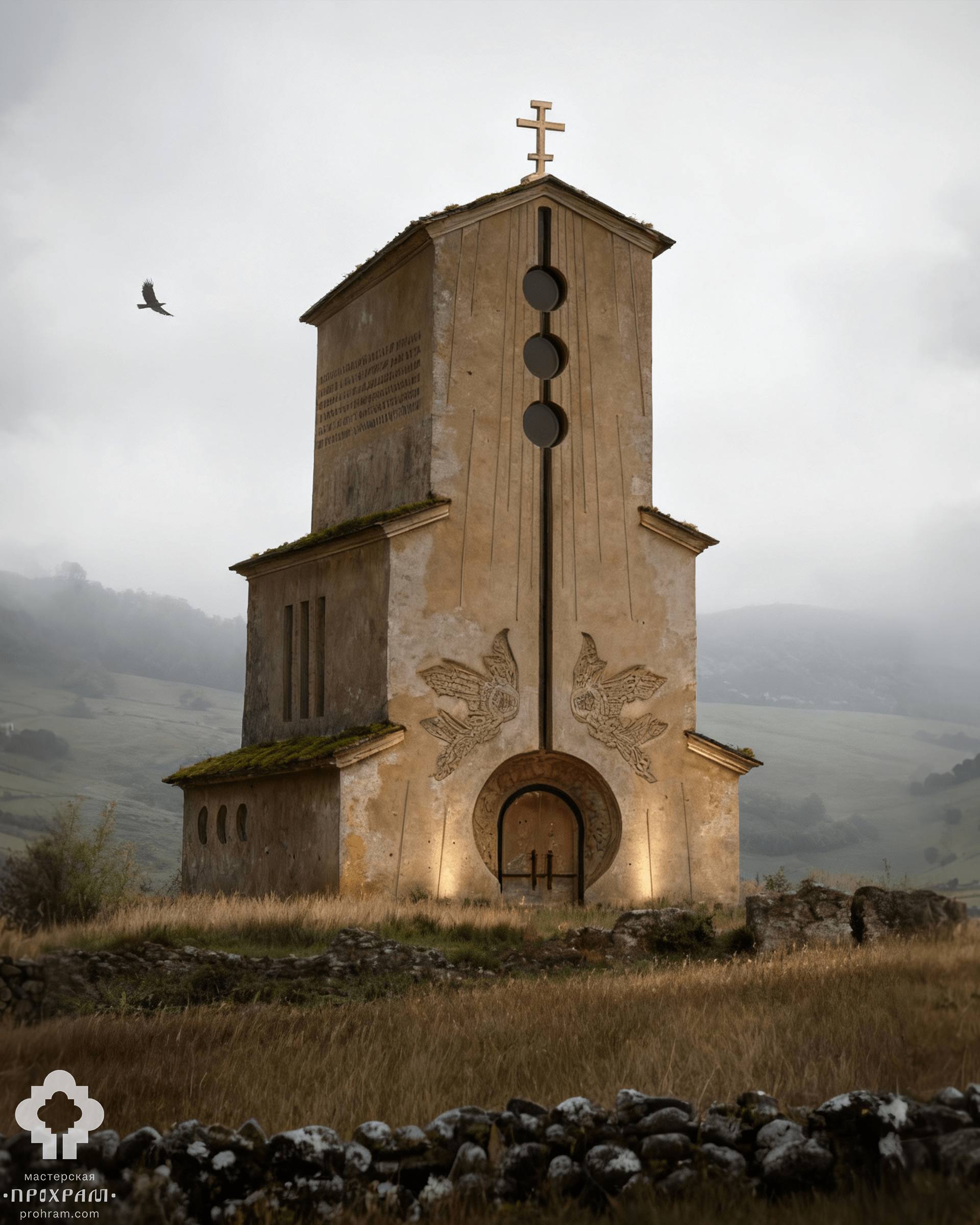 🔸Третья часовная (Восточная) — это устремленное вверх сооружение. Поверхность его стен предполагается выполнить в штукатурке, в технике «мазанка», специально с некоторыми утратами для придания архаичности (фото 5-6)