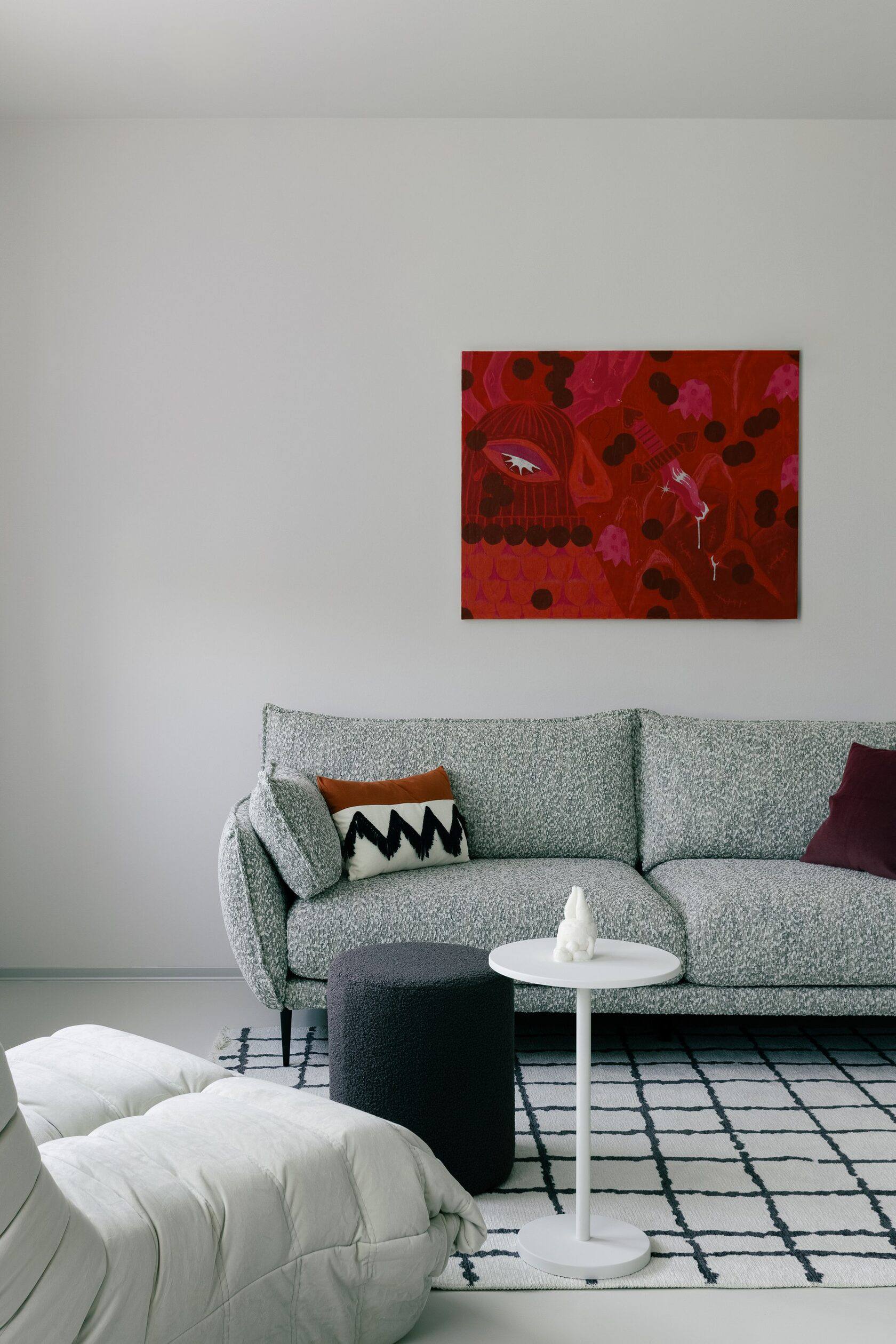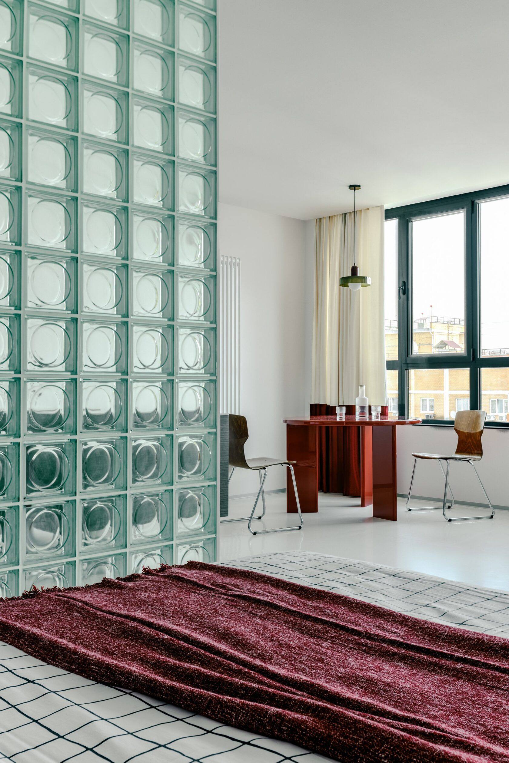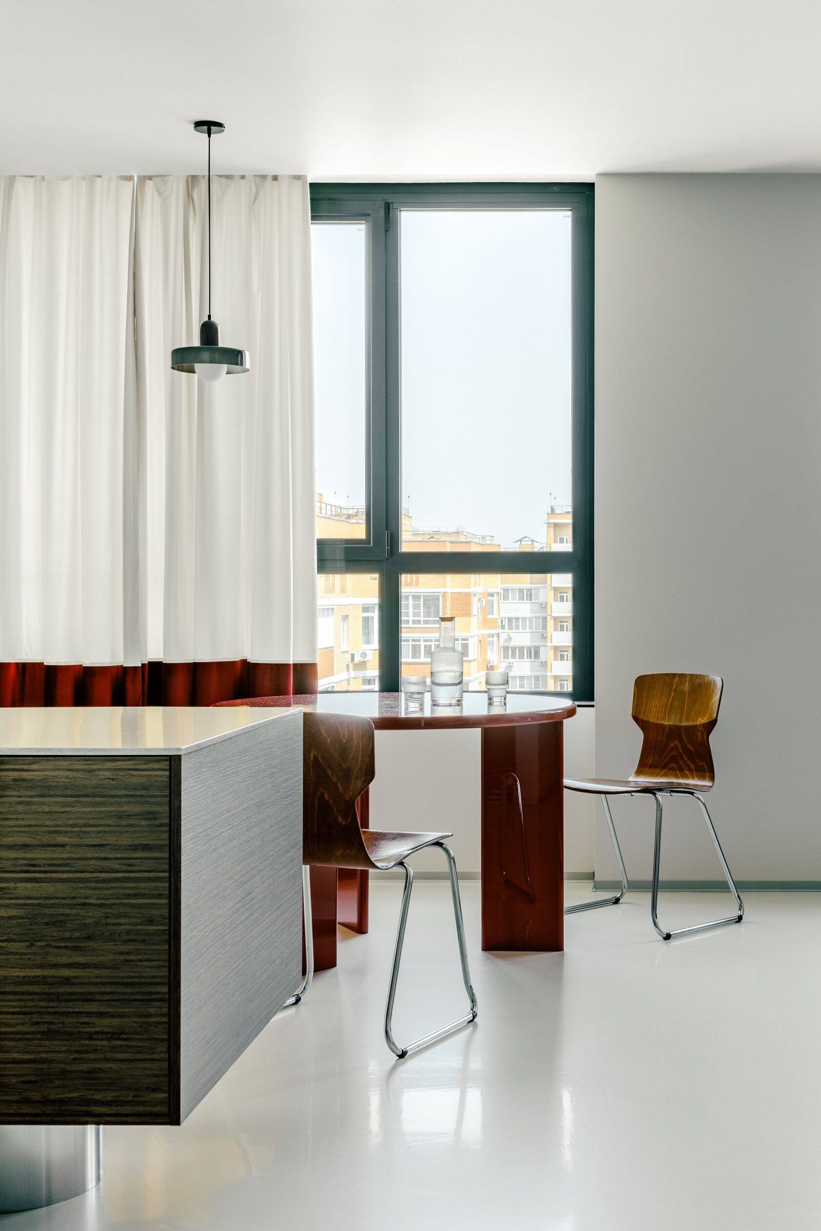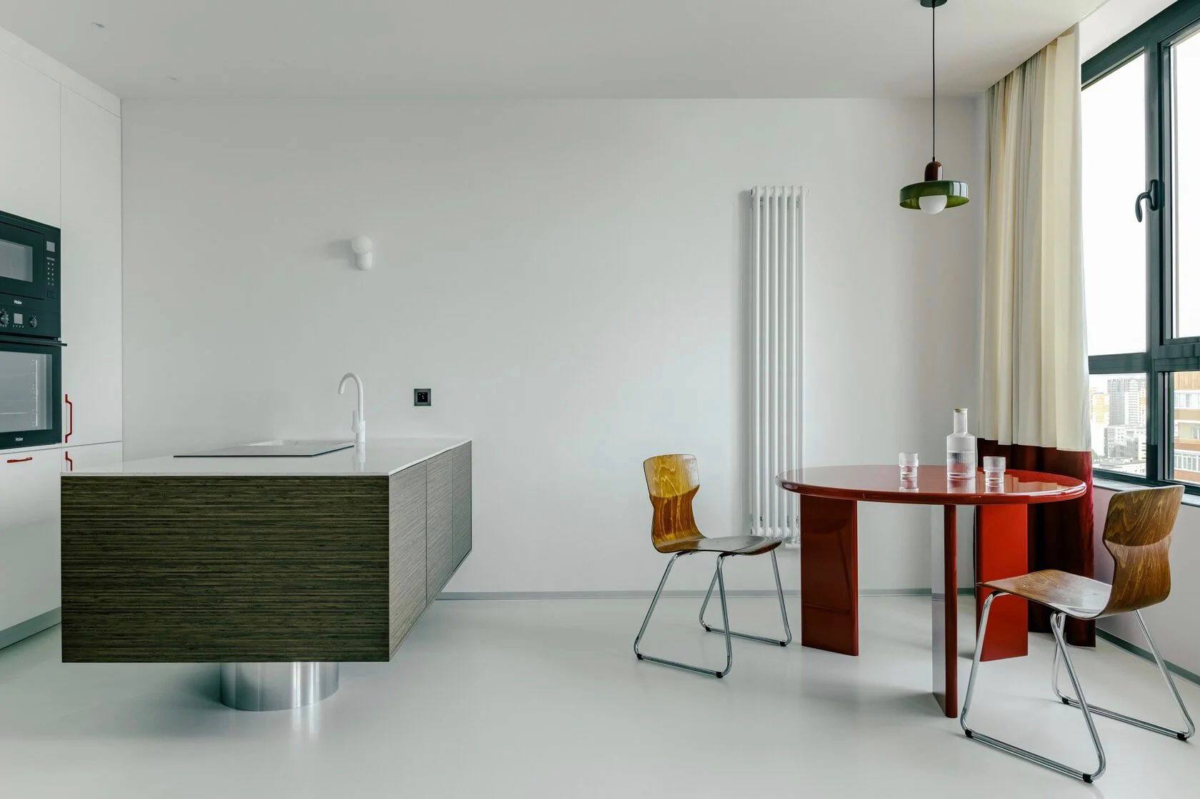🔸Белые стены и полы служат фоном для ярких деталей — например, насыщенного красного обеденного стола. Такая цветовая игра добавляет всему интерьеру динамики и индивидуальности, не нарушая общей концепции сдержанной элегантности.