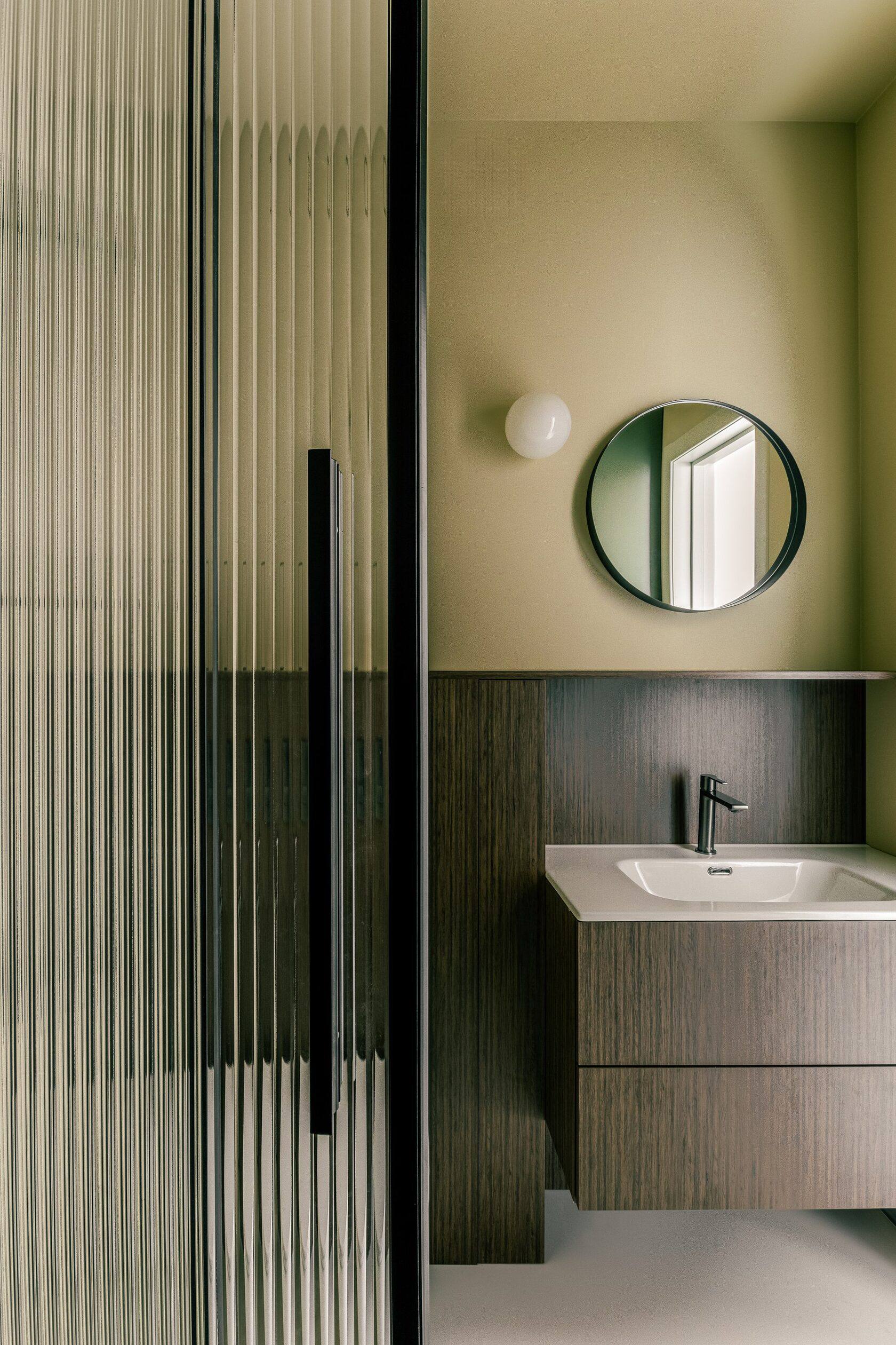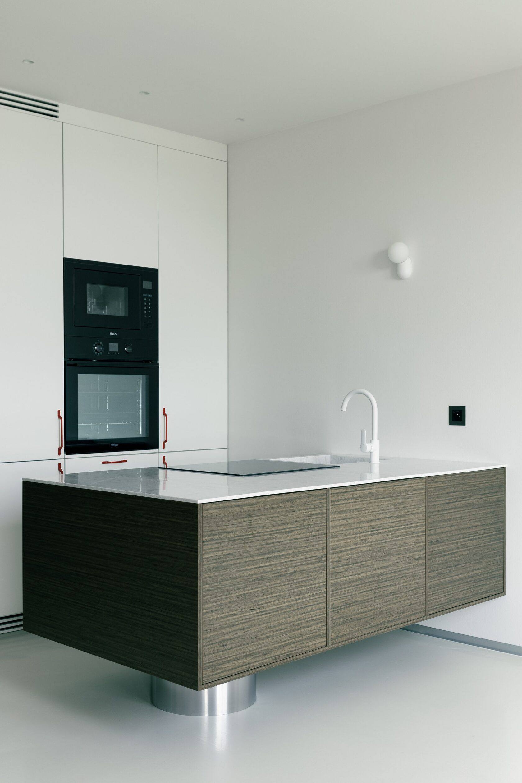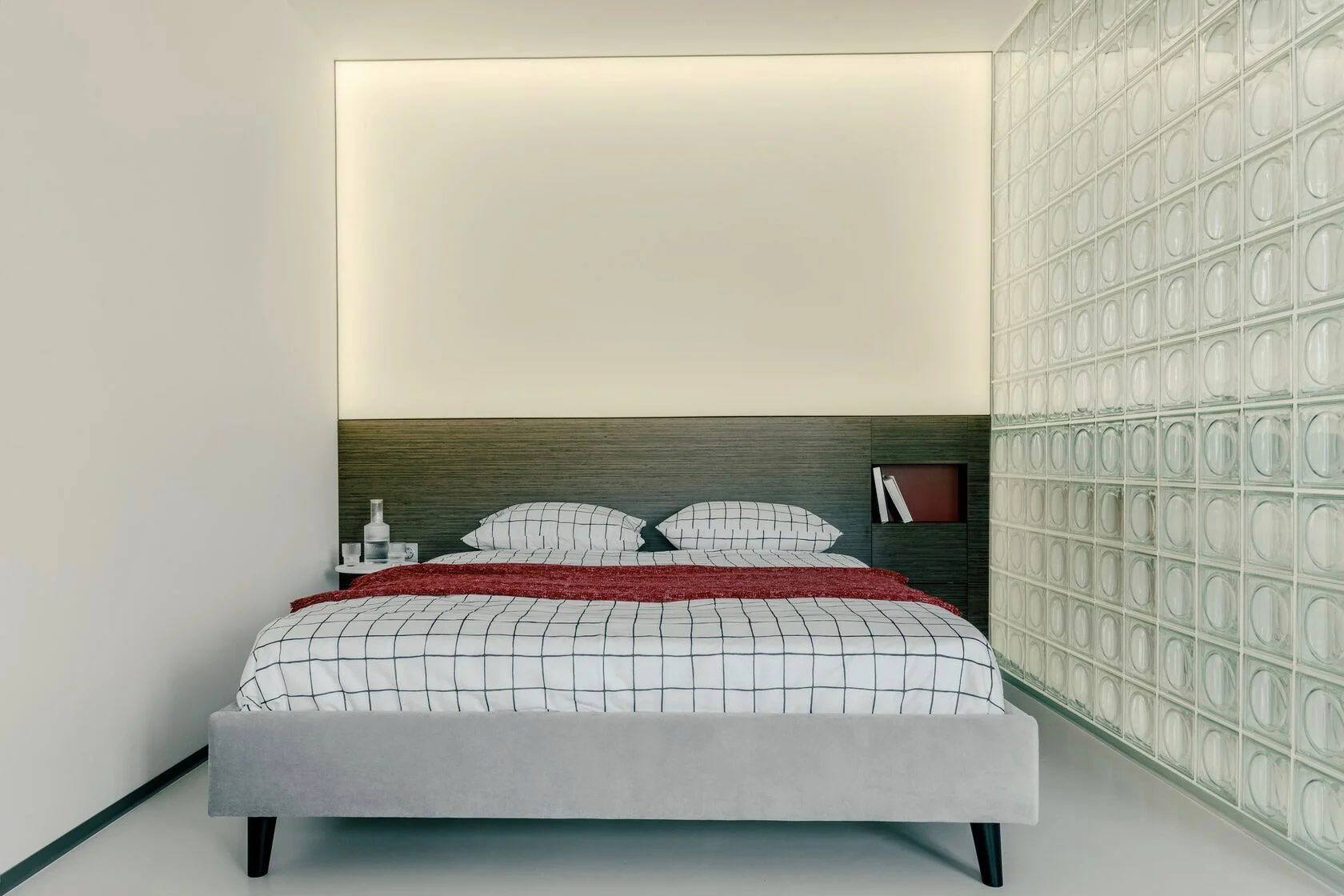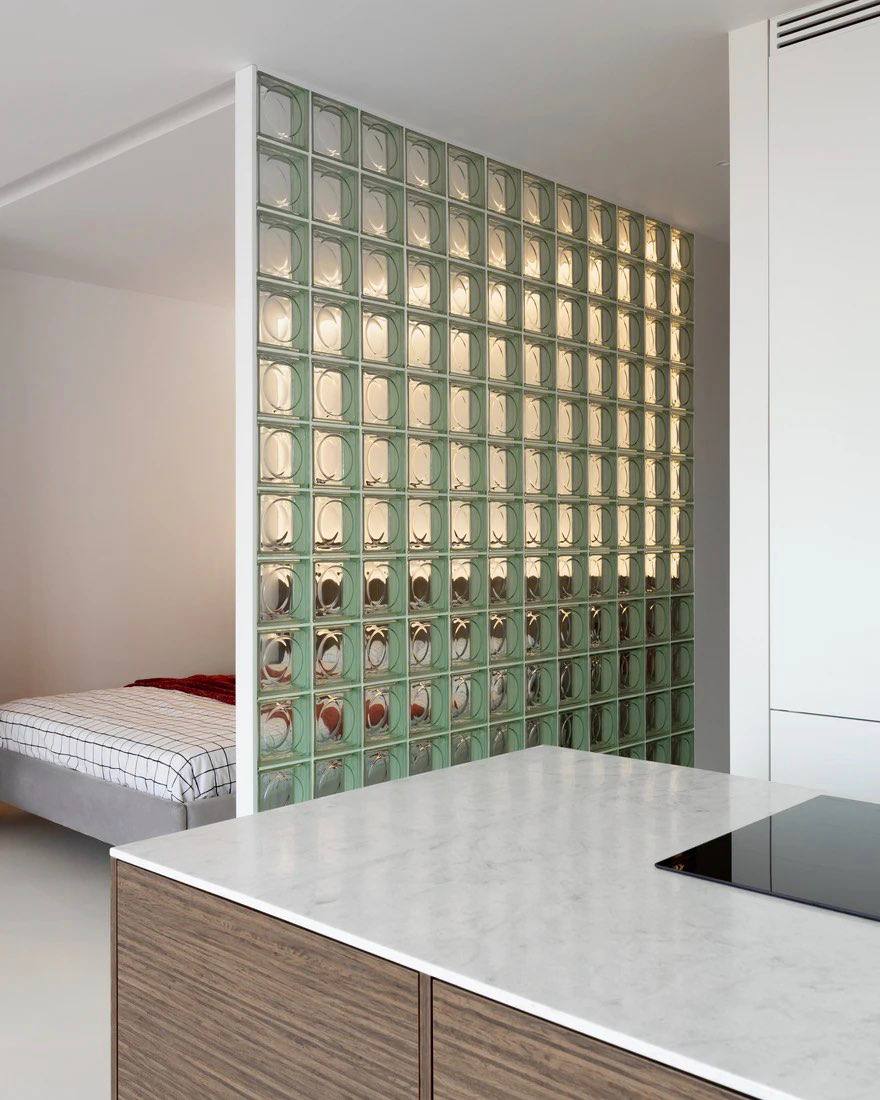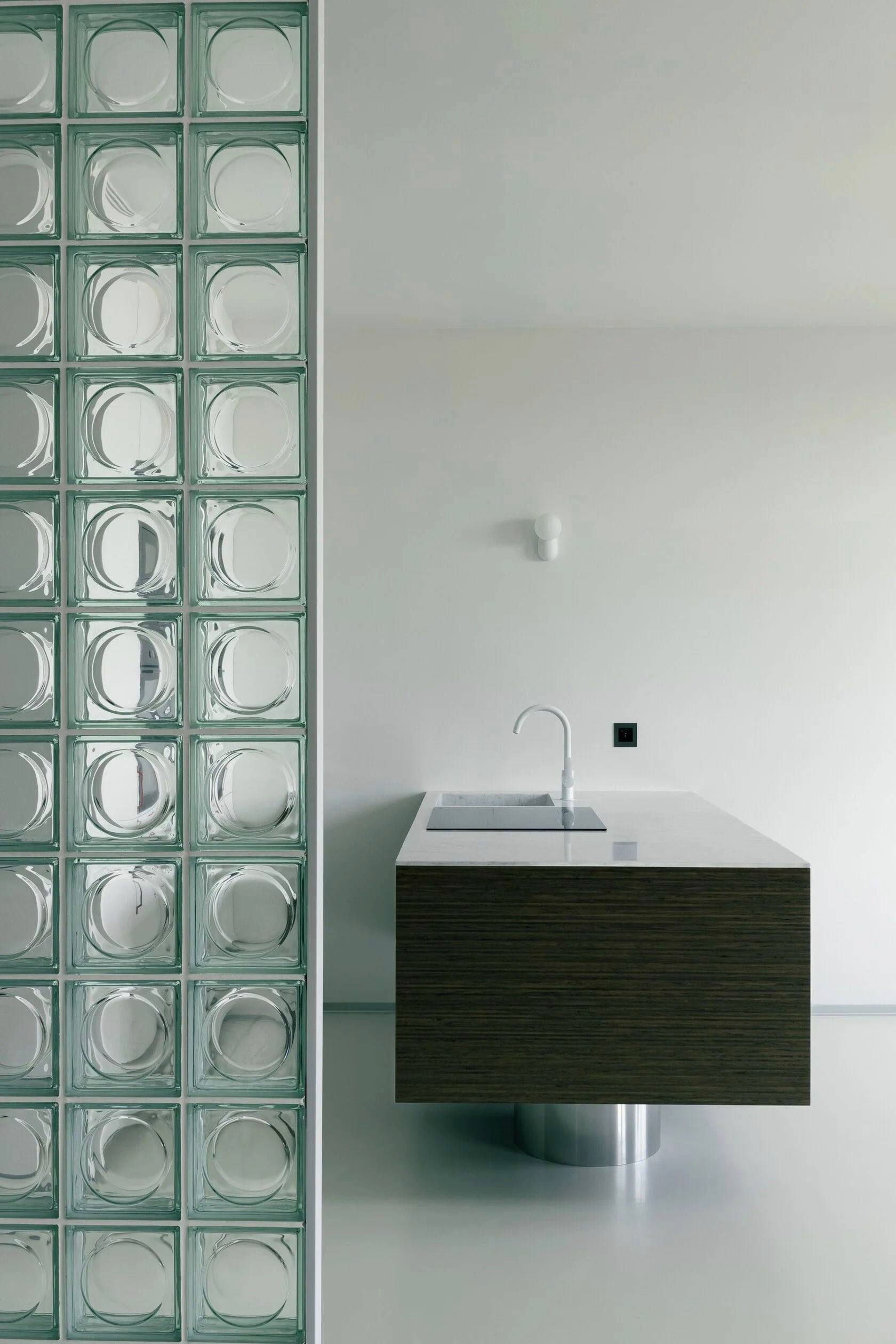 🔸Основной акцент в интерьере сделан на чистоте линий, светлых тонах и использовании современных материалов. Особое внимание привлекают стеклоблоки, которые зонируют пространство и пропускают мягкий естественный свет. Кухонный остров с опорой из нержавеющей стали становится не только практичным рабочим местом, но и стильным акцентом интерьера.
